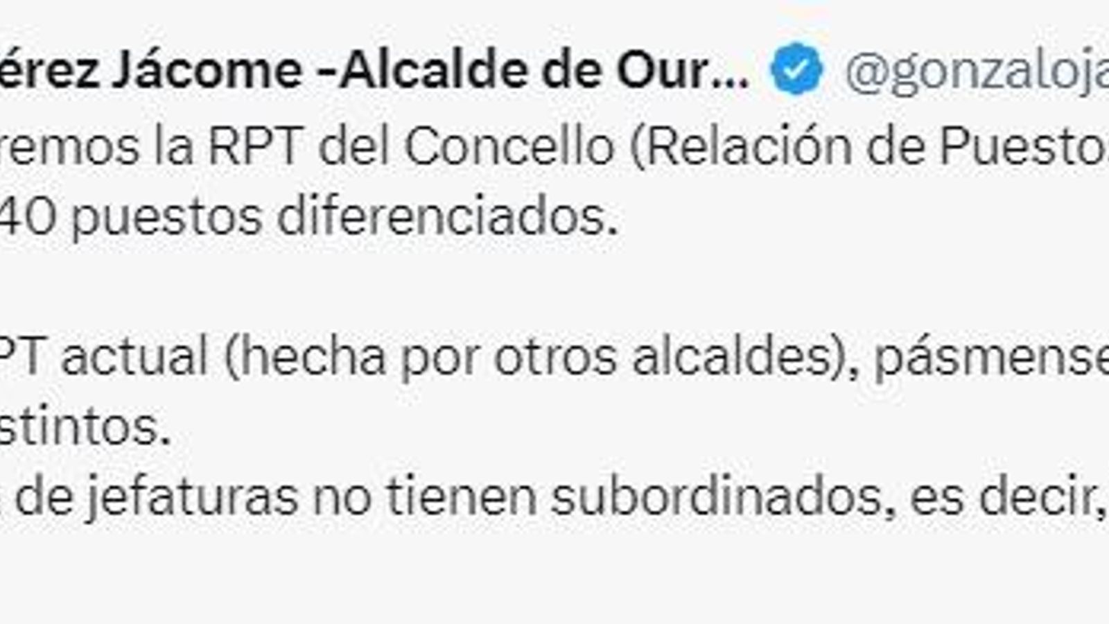 Además, avanzó que cambiará el funcionamiento interno del Concello, con una nueva Relación de Puestos de Trabajo (RPT) que eliminará la mayoría de “puestos estancos” y la “falacia de la especialización”. Para ello, clasificará los puestos de trabajo en una veintena de categorías frente a las 230 actuales, prometiendo convertir al ayuntamiento ourensano en el que “mejor funcionará de toda España”. En este sentido, dijo que con la RPT vigente, hay dependencias municipales en las que “hay un jefe de sí mismo”. También promete acelerar las licencias en Urbanismo: “Se acabó el cachondeo”.