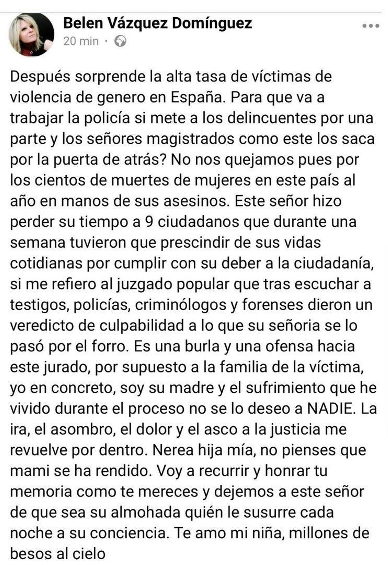 Tras su presencia en la marcha del 8M, Belén Vázquez, madre de Nerea Añel, publicó ayer un mensaje en las redes sociales: “Soy su madre y el sufrimiento que he vivido durante el proceso no se lo deseo a nadie”, escribió.