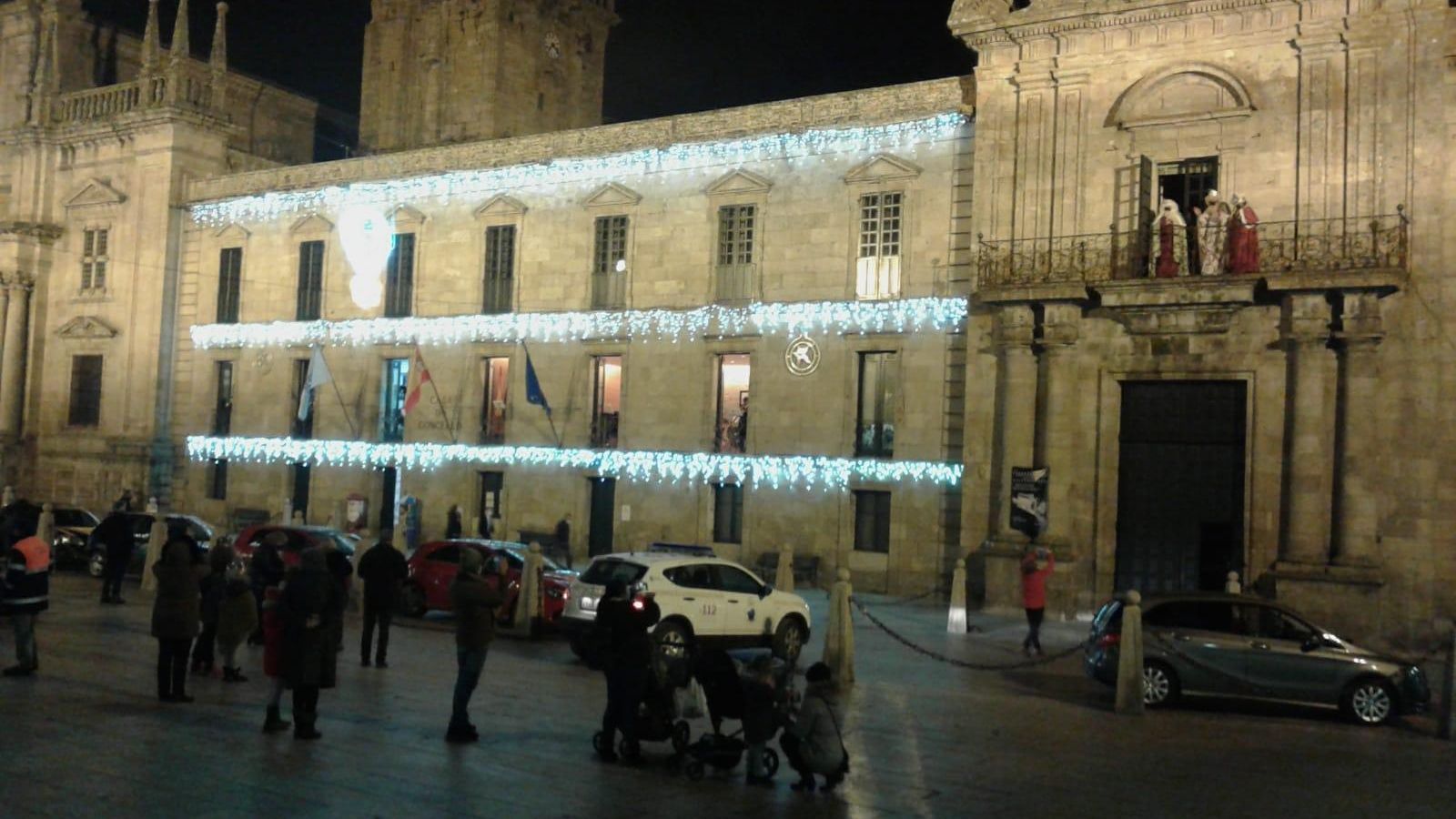 En Celanova, Melchor, Gaspar y Baltasar salieron por sorpresa al balcón del Consistorio para saludar a las personas que, pasadas las siete de la tarde, se encontraban en la Praza Maior disfrutando de la Banda de Música.
