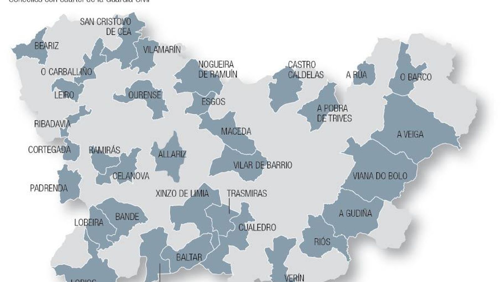 El último cuartel cerrado en Ourense fue en el año 2013, en Entrimo, y también se cerró en los últimos años el puesto auxiliar de A Mezquita. De esta forma, el instituto armado tiene actualmente 33 puestos en Ourense, Carballiño, Cea, Tamallancos (Vilamarín), Beariz, Ribadavia, Cortegada, Leiro, Celanova, Bande, Ponte Barxas (Padrenda), Lobeira, Lobios, Maceda, Esgos, Luíntra (Nogueira de Ramuín), Calvos de Randín, Baltar, Xinzo de Limia, Allariz, Freás das Eiras (Ramirás), Vilar de Barrio, Verín, Cualedro, Trasmiras, Riós, A Gudiña, Maceda, Castro Caldelas, Trives, A Rúa, O Barco, Viana, A Veiga.