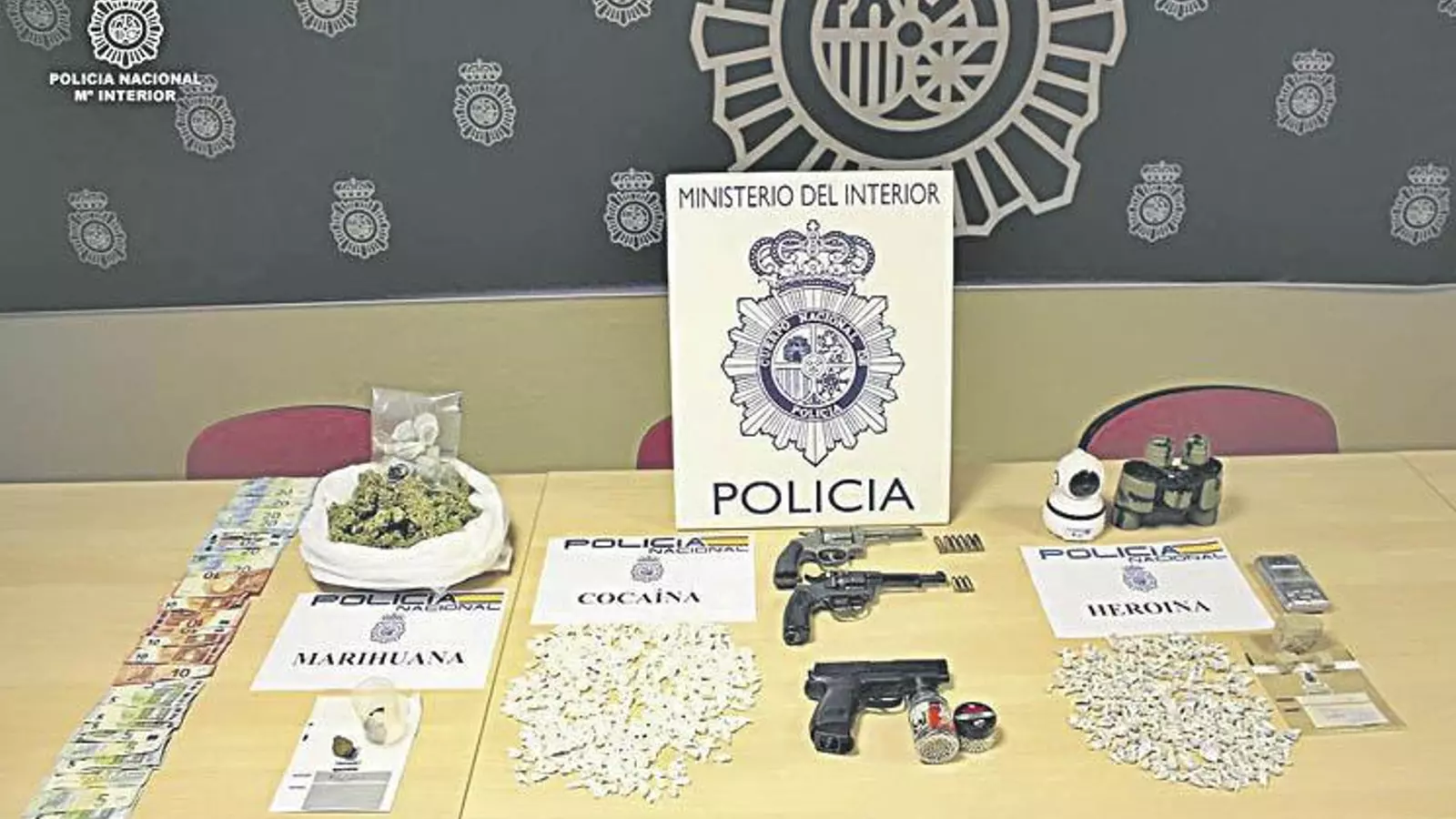 La Policía Nacional no tuvo que pasar de la cocina para saber dónde se cocinaba la droga: 380 dosis de cocaína, 328 de heroína, 82 gramos de heroína en roca y 173 gramos de cogollos de marihuana y seis gramos de hachís, además de sustancia de corte y 411 euros. En el dormitorio principal, dos revólveres con munición aptos para el disparo, una pistola simulada de aire comprimido y hasta una cámara de vigilancia y unos prismáticos.