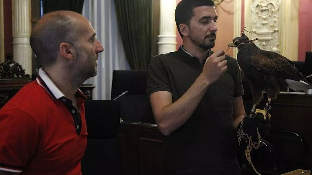 Juan Fraga, responsable de Larus Control, desgranó los detalles del plan, que empezará a la mayor brevedad posible. "Adaptaremos técnicas de cetrería para asustar a los estorninos en los lugares en los que se establecen", explicó el experto. Las aves, águilas de Harris, siempre irán acompañadas de un especialista y sobrevolarán las zonas más pobladas por las noches, para evitar interferencias con la vida de los vecinos. "El hecho de que vuelen les imprime a los estorninos miedo real, porque es un depredador natural", aseguró Fraga, que presentó a una de las águilas, Otea, en el salón de plenos.