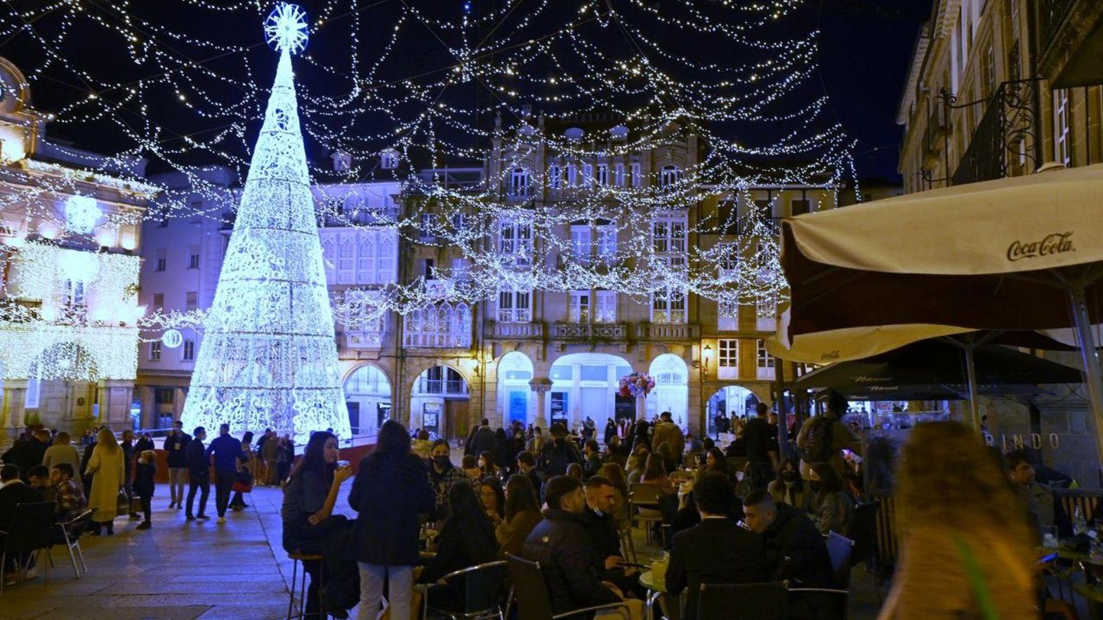 El buen tiempo y las altas temperaturas para esta época del año, unido a las nuevas restricciones impuestas en Galicia para intentar contener el avance de la sexta ola, han provocado que se llenasen las terrazas del centro de Ourense para celebrar de "tardeo" la entrada al nuevo año.