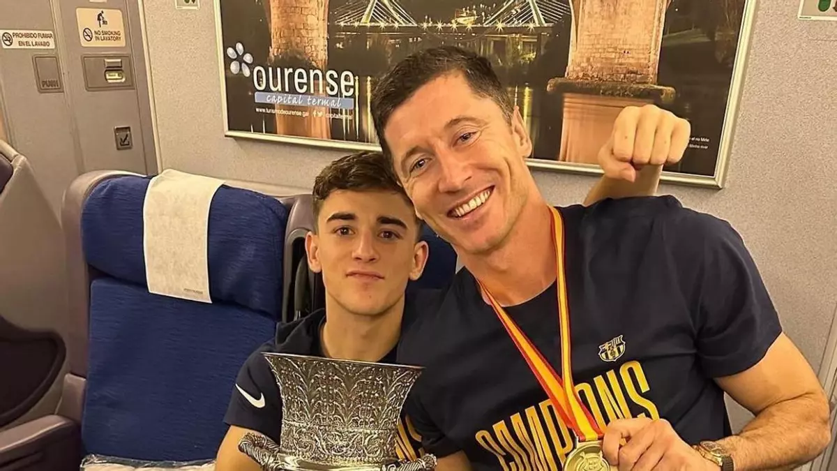 La imagen del delantero polaco corresponde con el viaje de vuelta de los jugadores azulgranas tras conquistar el título nacional. En la imagen, además de la fotografía de Ourense que promociona la ciudad, se ve a los dos jugadores azulgranas con el trofeo de la Supercopa de España y sus respectivas medallas. Ambos fueron dos de los goleadores del partido. Además, el joven Gavi fue elegido el MVP del encuentro al ser el jugador más destacado.