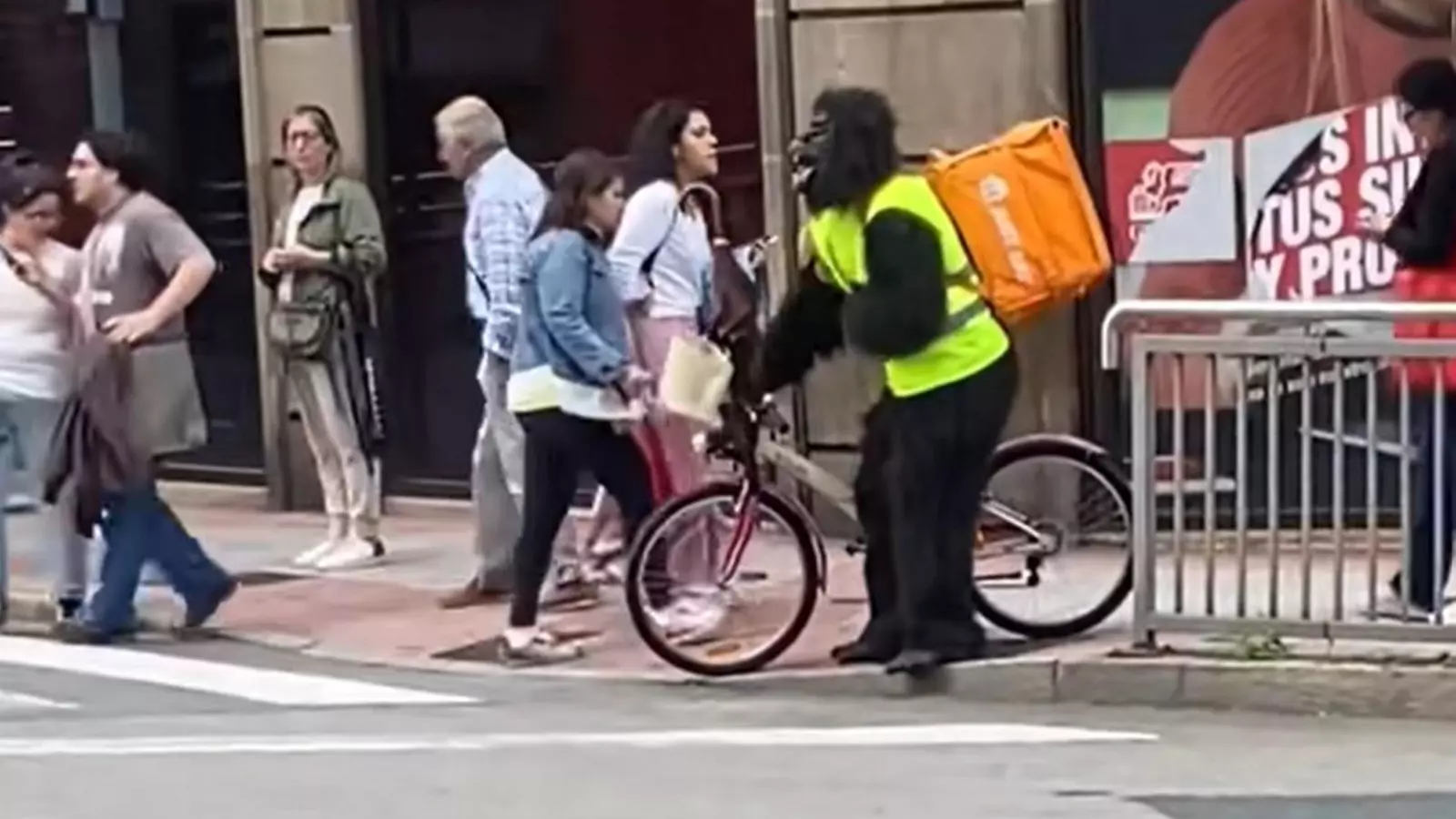 En los últimos avistamientos, este gracioso animal aparecía con la típica mochila que llevan los trabajadores de estas empresas, y recorriendo la ciudad con una bicicleta.