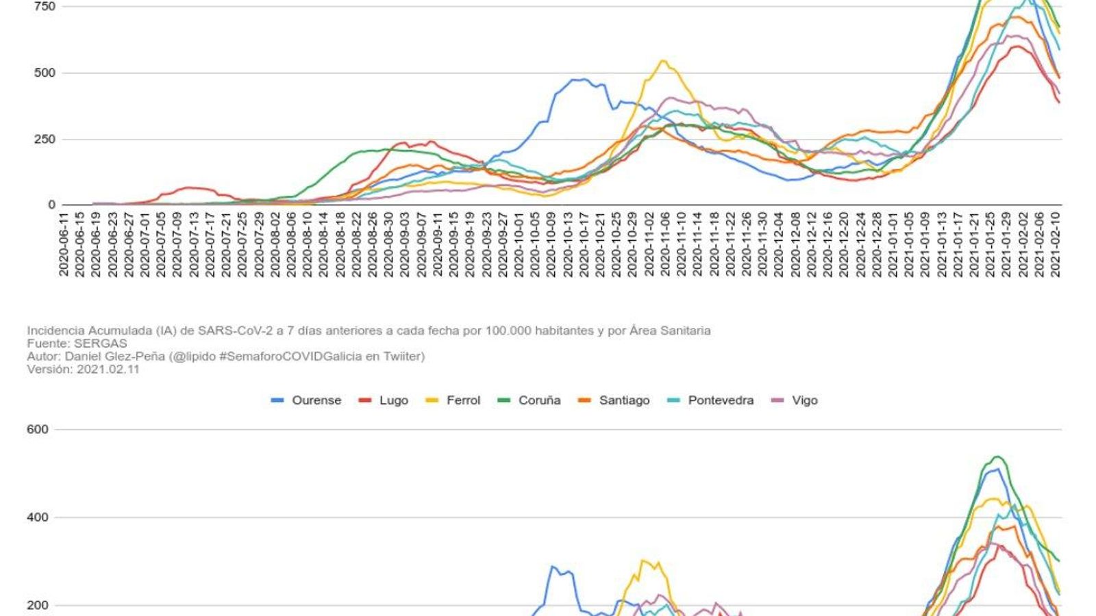 La incidencia acumulada continúa también su tendencia a la baja. Tras la actualización de las cifras, la incidencia a 14 días en la provincia es de de 480 por cada 100.000 habitantes (la cuarta más baja de las 7 áreas gallegas), mientras que a 7 días se sitúa en 165 por cada 100.000 habitantes (también la cuarta más baja).