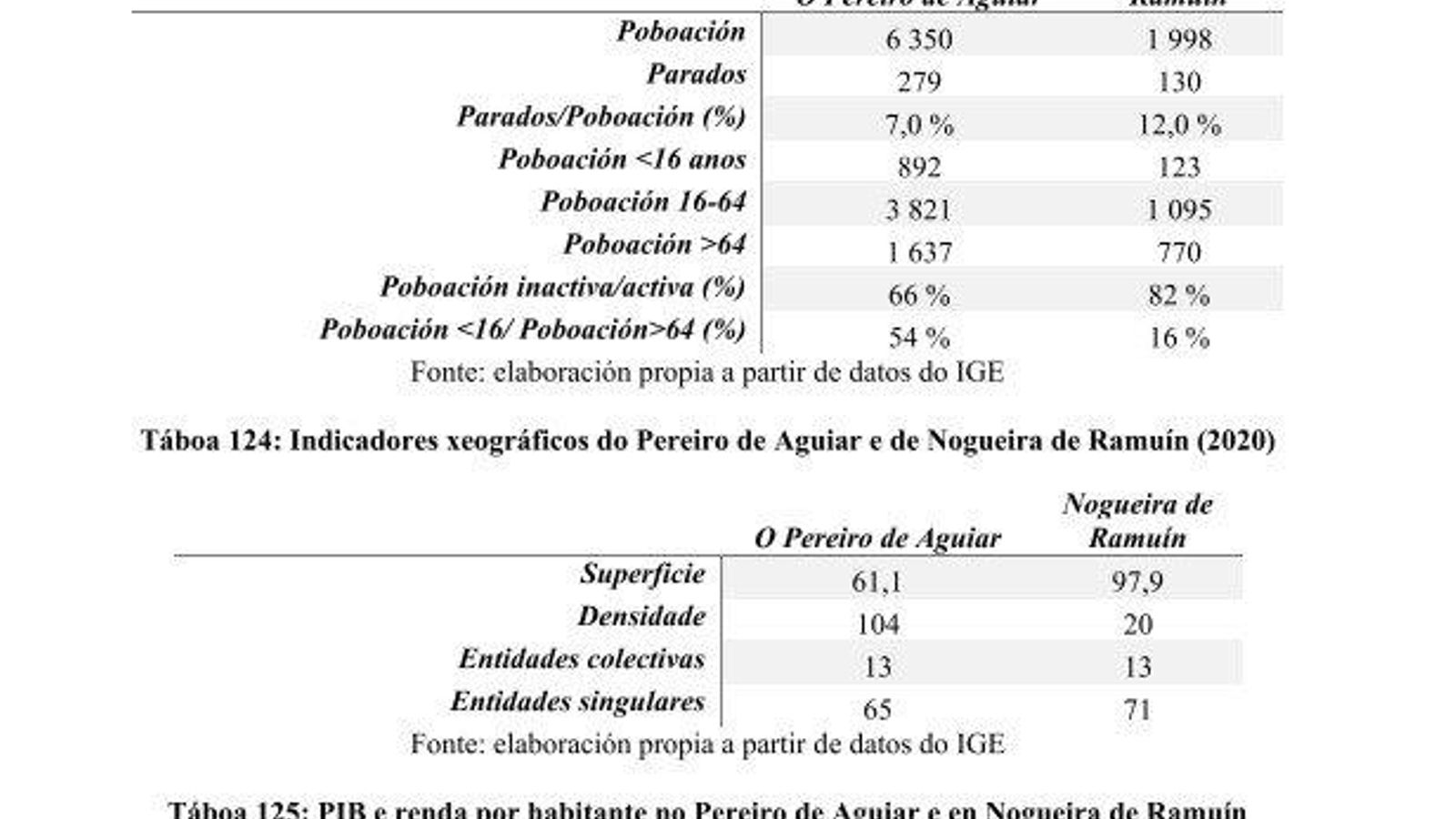 El documento otorga a Pereiro de Aguiar una superficie de 61 kilómetros cuadrados para una población de 6.350 personas, y a Nogueira de Ramuín 97,9 kilómetros cuadrados y 1.998 habitantes, lo que arroja un coeficiente de 104 personas por kilómetro cuadrado en Pereiro, mientras que la densidad desciende en Nogueira hasta las 20 personas. El estudio atribuye a Pereiro un mayor dinamismo demográfico, y a Nogueira un PIB superior.