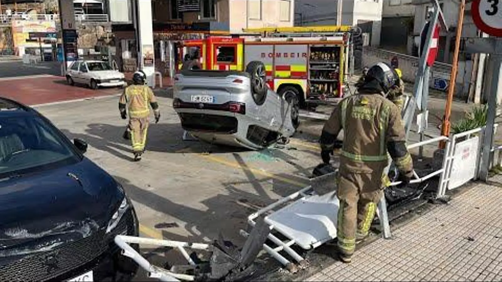 El coche se salió de la carretera y acabó dentro del parking de la gasolinera de O Piñeiral, tal como puede verse en las imágenes. La conductora habría quedado atrapada en un primer momento, aunque finalmente consiguió salir del vehículo.