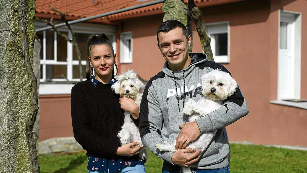 Laura Prada y Borja Neves, con sus perros Kimbo y Aria, en A Lamela (Pereiro de Aguiar). (Foto: Martiño Pinal)