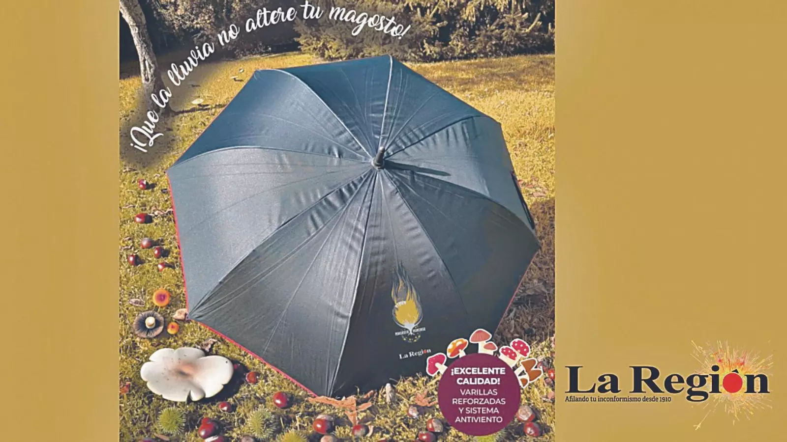 Los días 9, 10 y 11 de noviembre, por 9,95 euros + el cupón que se puede encontrar en el periódico, o por 7,95 euros si eres suscriptor. La Región, el lector puede conseguir un amplio paraguas, con varillas reforzadas y sistema antiviento. Disponible en color negro, con bordes y varillas rojas, luce una ilustración alusiva a los magostos en forma de castaña y las llamas de las hogueras típicas en estos días.