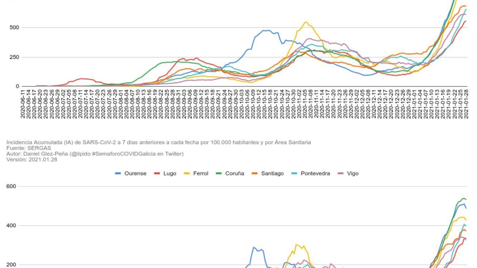 El crecimiento de los contagios también parece contenerse en la provincia, ya que se reduce desde hace días. Si el pasado viernes los casos crecían un 60% con respecto a la semana anterior, ahora el ritmo cae al 30%. El bioinvestigador informático Daniel González-Peña destaca que la caída del crecimiento, tanto en Ourense como en Galicia, hace suponer que "estamos más cerca del pico de la tercera ola". El comportamiento de los próximos días será clave para determinar si las curvas de contagios continúan en descenso o se estabilizan en la denominada "fase meseta" (no suben, pero tampoco caen).