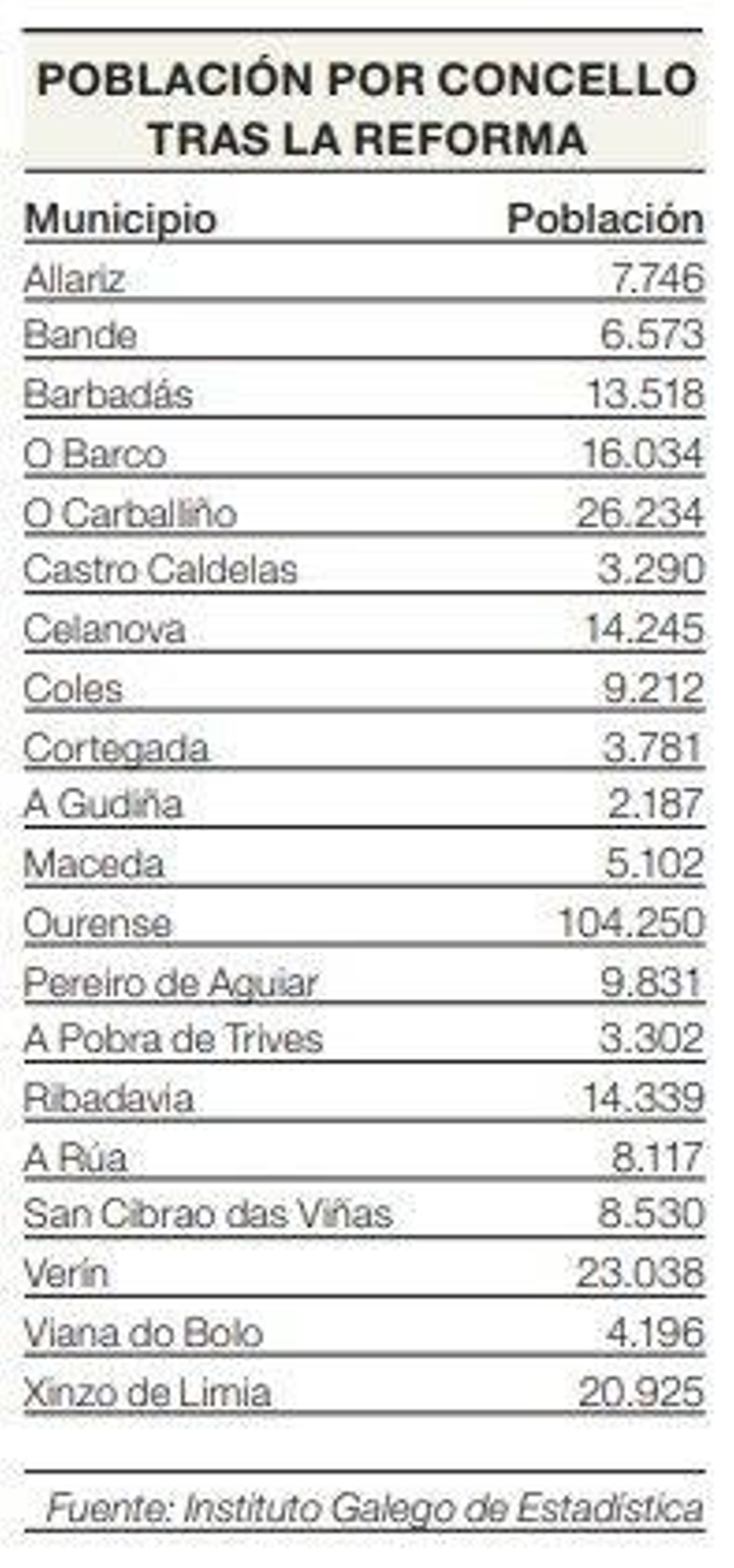 Con esta reagrupación de municipios que plantea el estudio de Francisco Domínguez, la provincia de Ourense pasaría de contar con solo cinco concellos que cuentan con más de 10.000 habitantes a tener un total de ocho grandes concellos que se encontrarían por encima de esta cifra. Además, cuatro ayuntamientos tendrían una población superior a los 20.000 habitantes, algo que en la actualidad solo se registran en la ciudad.