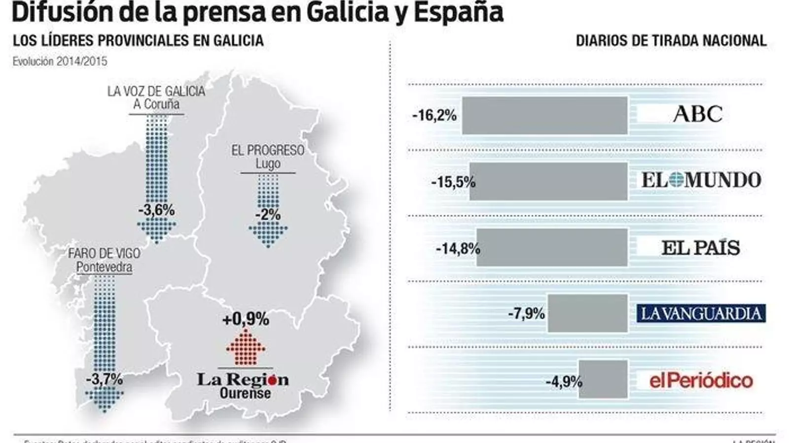 La Región se reafirma así como la excepción positiva entre las cabeceras de referencia en cada una de las cuatro provincias gallegas. La Voz de Galicia, líder en A Coruña, pierde a nivel general un 3,6% de difusión en 2015; Faro de Vigo, líder en Pontevedra, cae un 3,7%, mientras El Progreso, diario de referencia en Lugo, es el de menor descenso entre los diarios líderes gallegos, un 2%.