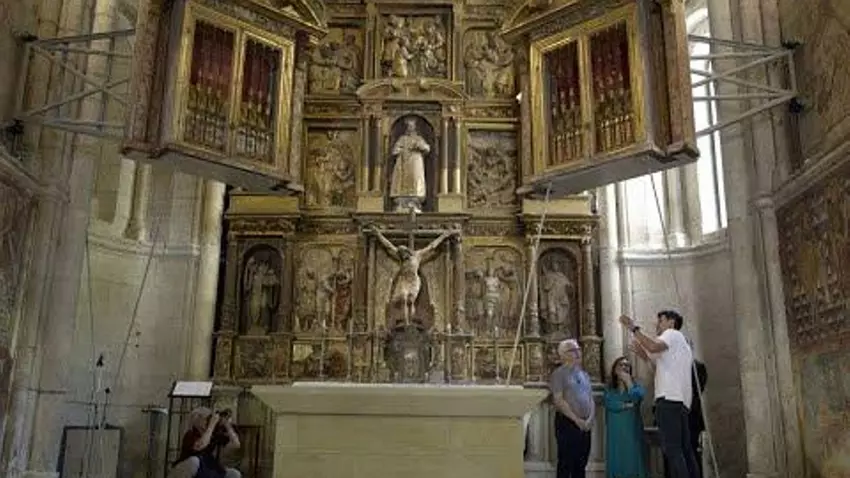 Tras descubrir estas obras la opción de volver a ocultarlas no podía siquiera contemplarse, por lo que se buscó un sistema que permitiese que los dos tesoros conviviesen. “Queríamos encontrar una solución para disfrutar de ambas cosas”, explica la restauradora, Vania López. Así, decidió instalarse un brazo móvil en cada retablo, financiado por la Fundación Iberdrola, con el que estos se pueden deslizar hacia un lado para poder contemplar el ciclo de pintura mural de los laterales de la cabecera de la iglesia.