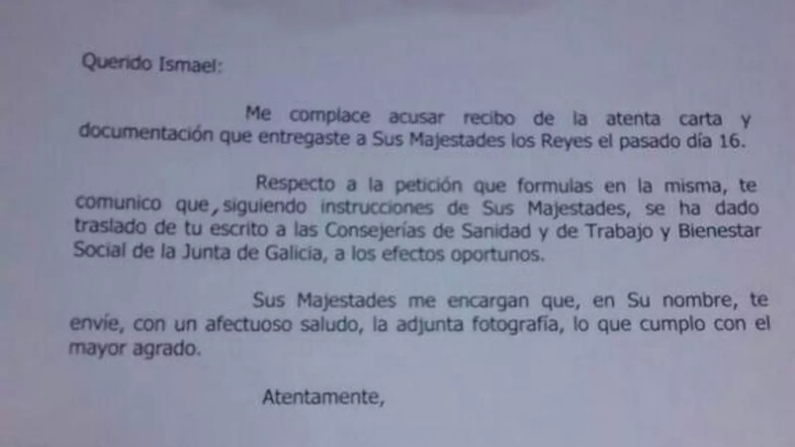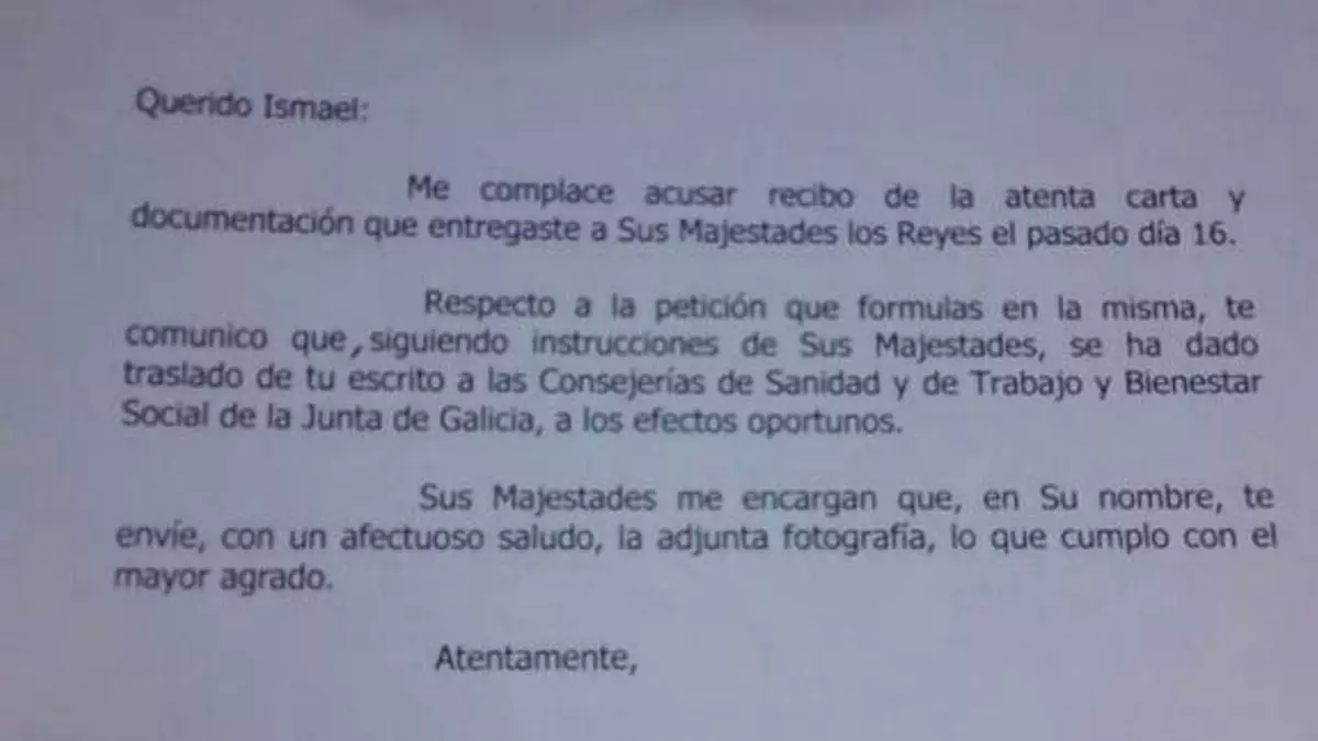 "Doña Letizia prometió respondernos y así lo hizo, pues ayer nos dejaron en el buzón un aviso de carta certificada, porque no estábamos en casa, y hoy fui a buscarla y en ella nos explica que dieron traslado del tema a las consellerías de Sanidade y Traballo e Benestar Social", ha detallado.