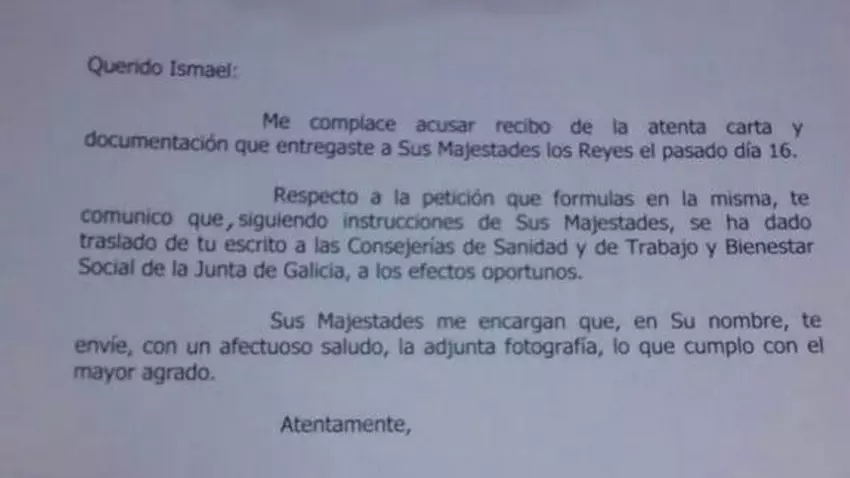 Según ha explicado Cabanelas, este martes recogió en Correos una carta enviada por la Casa Real, tal como les había prometido doña Letizia cuando le explicaron en persona la situación del niño y le entregaron una carta, recortes de prensa y documentación, aprovechando la visita de los Reyes al colegio Ben Cho Sey de Pereiro de Aguiar (Ourense), donde los monarcas inauguraron oficialmente el curso escolar en España.