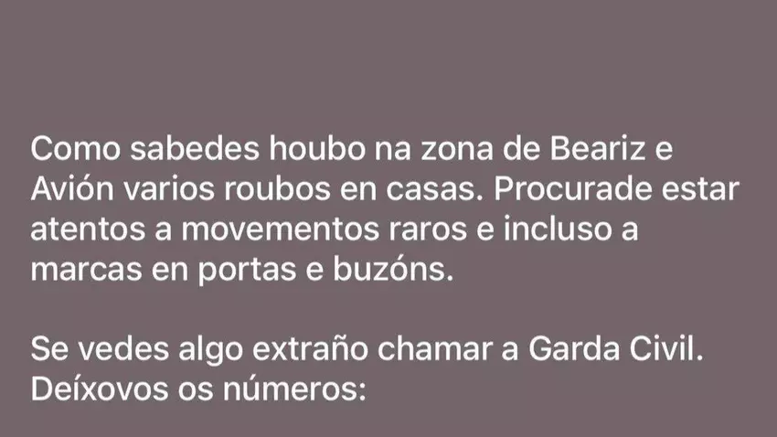 ¿Sabe usted que toda precaución es poca? ¿Que hace unos días la alcaldesa de Boborás, Patricia Torres, pidió a sus vecinos que estén atentos a movimientos raros e incluso a marcas en puertas y buzones? ¿Que lanzó este mensaje tras los robos en varias casas de Beariz y Avión?