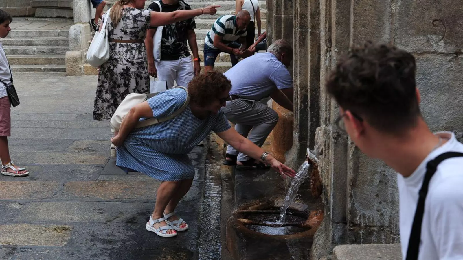 Una turista toca el agua de la fuente de As Burgas.