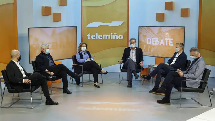 José Araújo, Miguel Caride, Flora Moure, Antonio Nespereira (moderador), Rafael Villarino y Luis Seara, en un momento del debate organizado por Telemiño (XESÚS FARIÑAS).