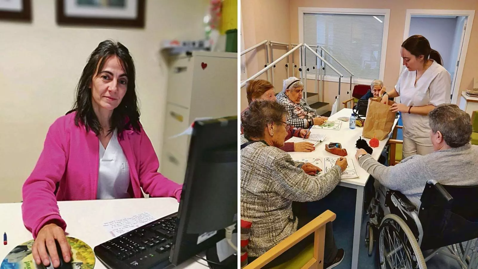 Esta psicoterapeuta trabaja “con usuarios grado tres, que deben utilizar silla de ruedas” con los que desarrolla, entre otros, ejercicios de gerontogimnasia para mantener activos brazos y piernas. Pero también hay otros talleres en los que los alrededor de 40 usuarios a su cargo desarrollan diversas facetas cognitivas o psicomotrices.