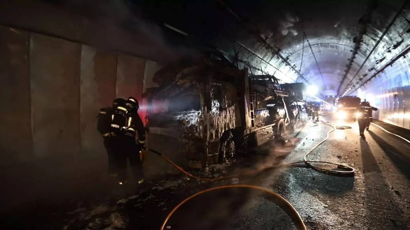 Los bomberos, sofocando el incendio que mantiene cerrada el túnel desde enero. // Alberte