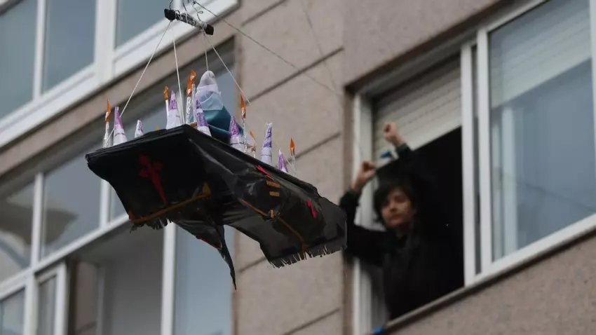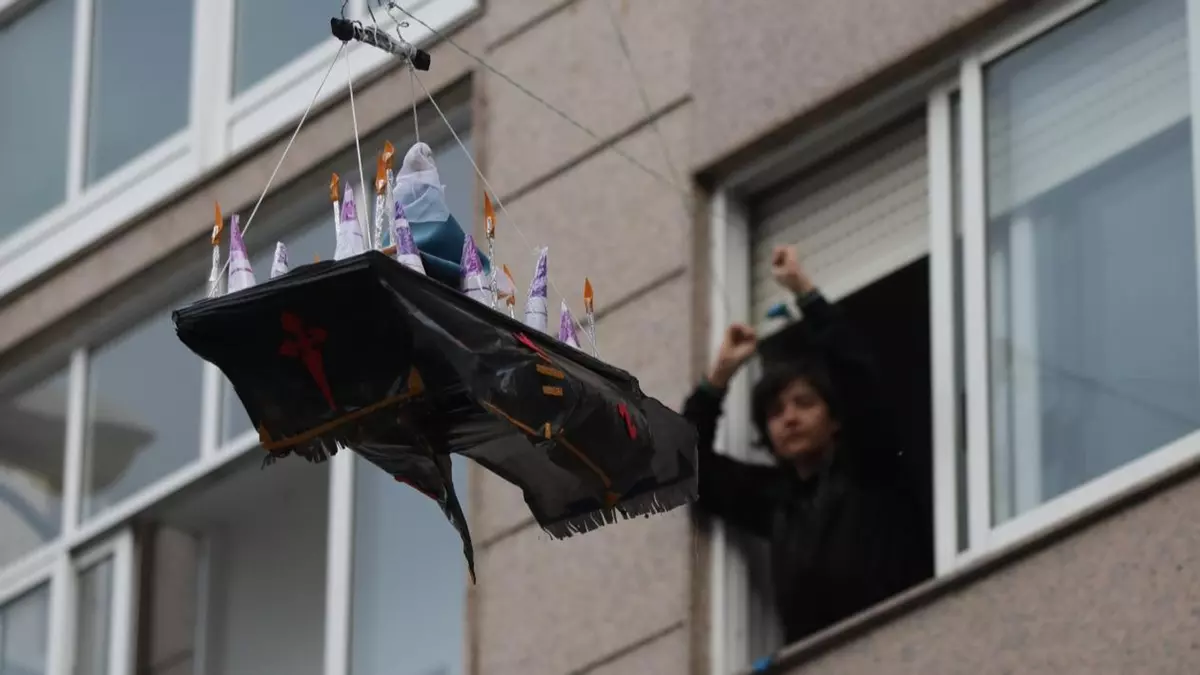 Pasan de las ocho de la tarde del Viernes Santo, y toda la calle González Cachamuíña está en los balcones. Lo que empezó con el aplauso a los médicos y el "Resistiré" ahora ya son cuatro o cinco canciones. Y en Semana Santa, una procesión entre balcones. "Viva la virgeeeeeeeeeen", se escucha mientras asoma por una ventana un pequeño paso –al que no le falta detalle, con una barbi de virgen y nazarenos con plástico por si llueve–, que empieza a moverse entre los tirones de los costaleros. Yago y Naique, vecinos de ventanas enfrentadas, van tirando de las cuerdas que plantaron en sus balcones. Ambos son dos de los impulsores de la procesión."Muchos ni nos saludábamos, por no conocernos. Ahora tenemos grupo de wasap y preparamos una fiesta para cuando esto acabe", explica Eva, que elaboró el paso. Los niños Mariela y Nathan hicieron los nazarenos. La música es cosa de Javier y Manuel. Los aplausos y los olés, de todos.