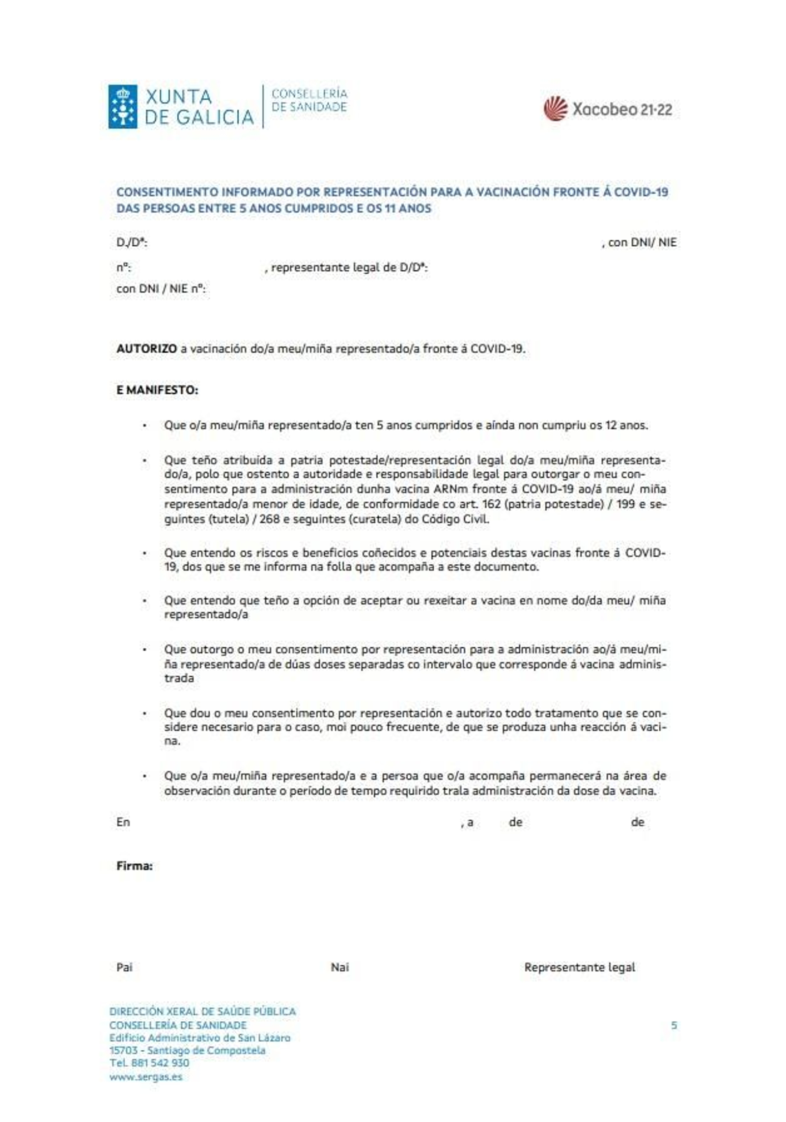 Los padres de los menores citados para vacunarse deberán entregar un documento en el que dan el consentimiento de que los menores a los que representan reciban la dosis de la vacuna. Este documento se envía con el SMS de la citación y también se puede descargar en la web del Sergas.
