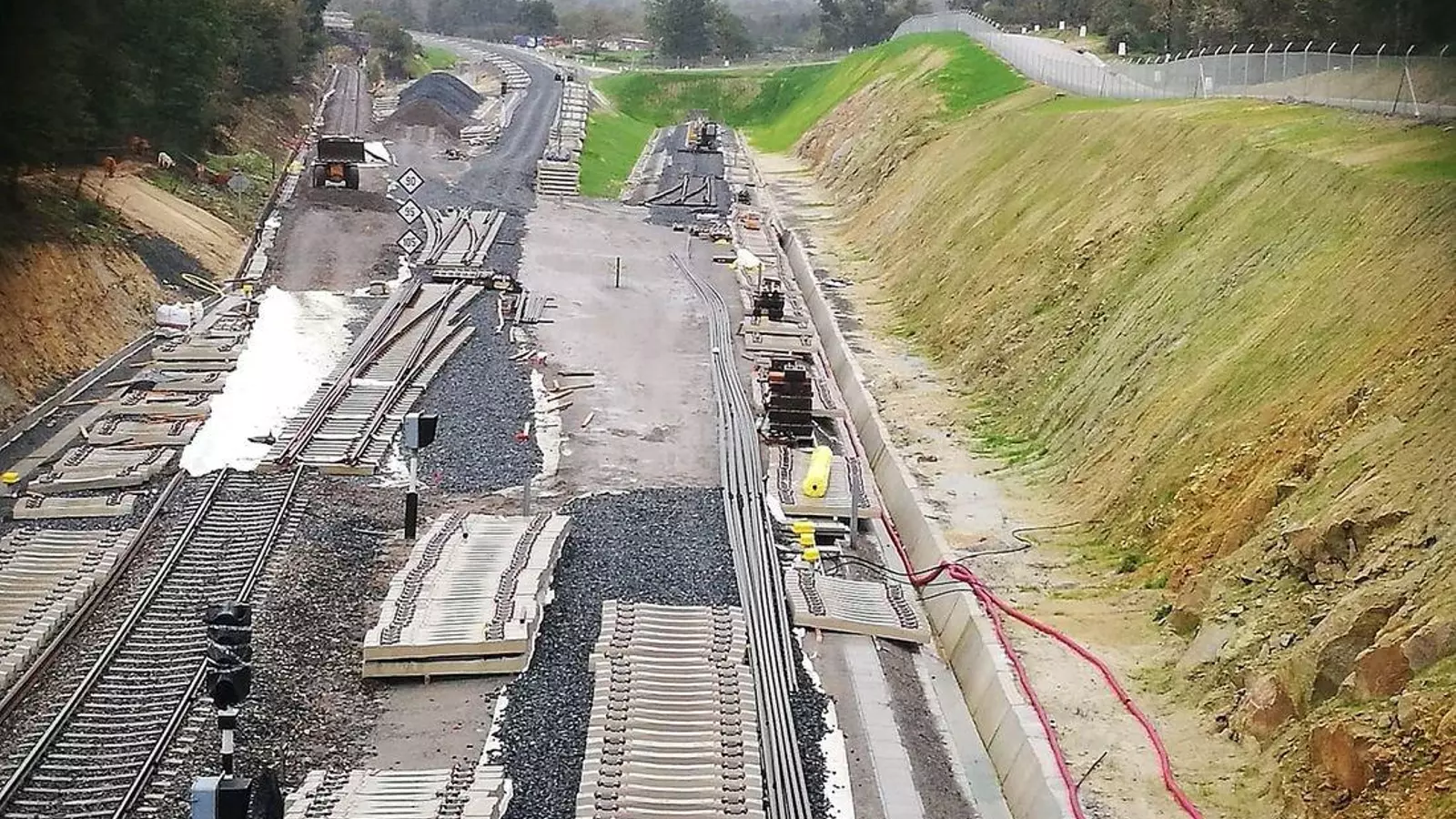 La nueva vía tiene todavía dos carriles, en vez de los tres que hacen falta para que puedan circular indistintamente trenes de ancho convencional y de ancho estándar de alta velocidad, a la espera de que se realice el bateo del balasto con el que se asiente definitivamente la vía.