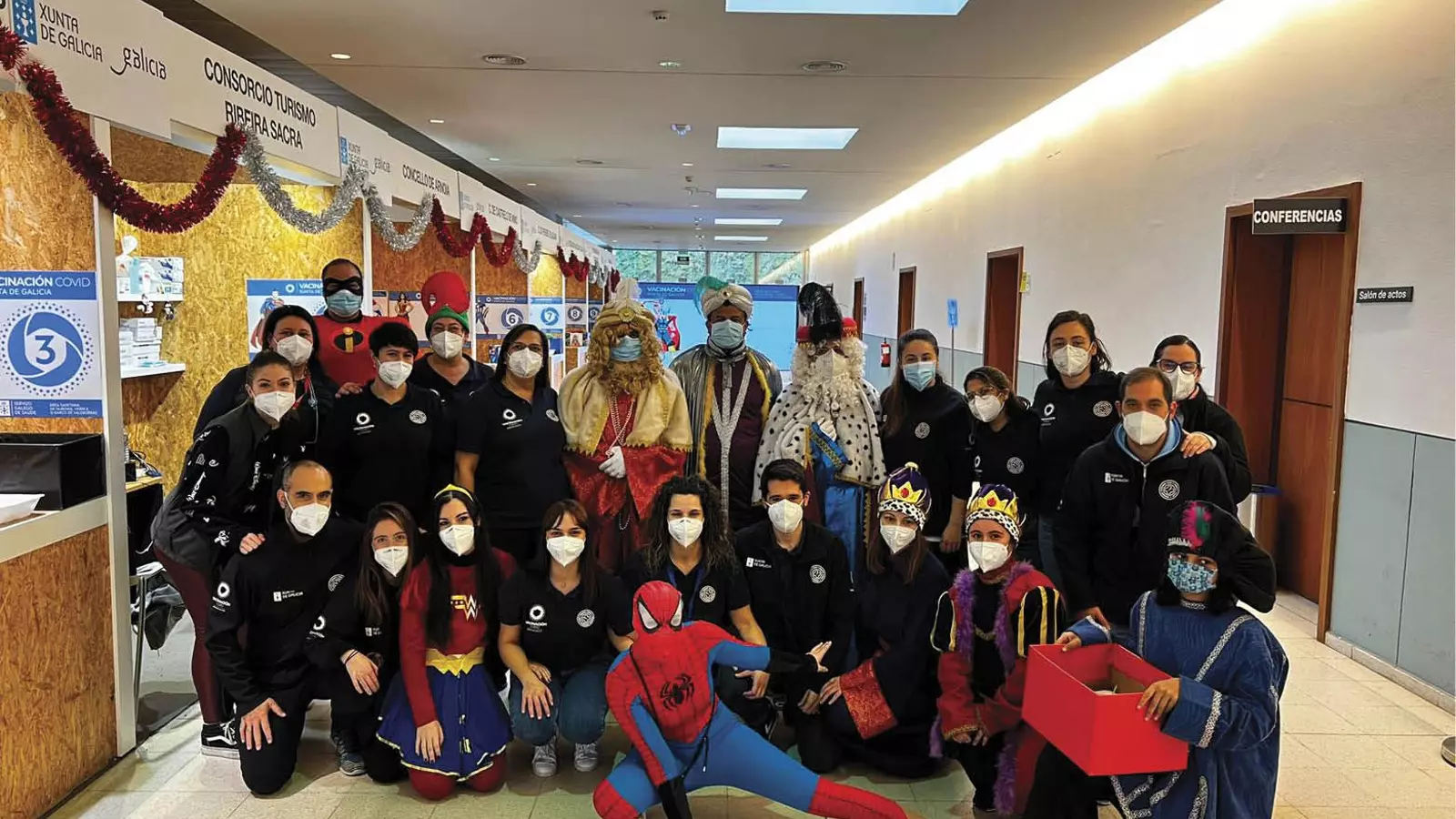 Los Reyes Magos estuvieron ayer presentes en el punto de vacunación de Expourense, donde se siguieron vacunando contra el covid niños de las franjas de edad entre 7 y 9 años. Un total de 3.512 estuvieron citados en la provincia de Ourense tanto el martes como ayer, acudiendo a la cita alrededor del 76% de los convocados. Mañana viernes continuará la vacunación con personas de 40 a 49 años más repescas.