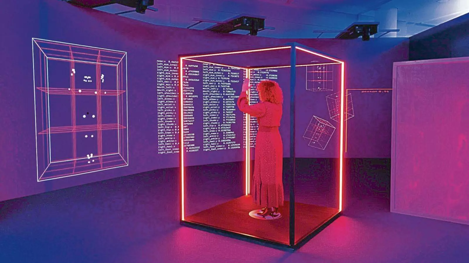 Esta “visión colectiva”, en palabras del responsable autonómico, ofrece una “reflexión diversa y coral sobre cuestiones de plena actualidad”, como el empleo de herramientas de inteligencia artificial (IA), la creación de gemelos digitales y la polarización y el acoso en la red. Dentro de la sala “Atravesar la pantalla”, que recoge ejemplos de réplicas digitales, se encuentra la obra interactiva “Bounding box”, de Solimán López, que estuvo presente en la visita destinada a la prensa. Consiste en un cubo de luz que, a través de la recopilación de datos biométricos del movimiento, reconoce la silueta de las personas que permancen dentro de él.