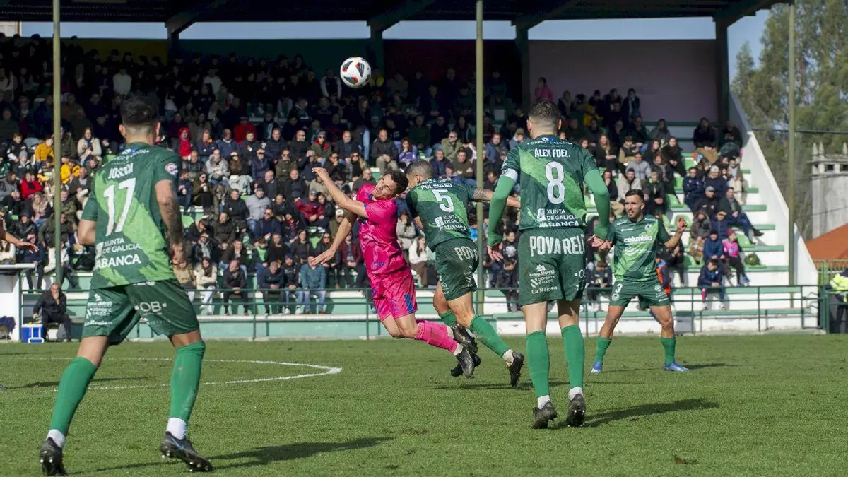 El derbi se presentaba con emoción y también con la esperanza de que se pudiera ver un buen encuentro, aunque no suele ser lo más habitual. Tampoco lo fue esta vez, aunque el campo no ayudó. La mañana era gélida y aunque el termómetro marcaba entre tres y cuatro grados, la sensación térmica era menor de ese guarismo. El campo estaba muy resbaladizo y en la banda de enfrente a la tribuna (donde se va a instalar la grada supletoria para el partido de Copa del Rey), estaba blanca como si hubiera nevado. Era hielo. Tras el tanteo inicial en el que los de Rubén Domínguez salieron mejor al verde llegó el primer arreón local. Después de dos saques de esquina que el meta Marqueta sacó de nuevo a córner luego de los remates de Romay de cabeza y Álex Fernández con la derecha, y luego de otro saque de esquina sin consecuencias, dio la sensación de que a los de Rubén Domínguez les costaba cada vez más frenar los ataques locales. Así, llegó el único gol del partido. Álex Fernández colgó con calidad una pelota en el área que remató Antón Escobar con la derecha, salvó bien Raúl Marqueta, pero le cayó el rechace de nuevo a Escobar que esta segunda opción no perdonó y con la izquierda mandó el balón al fondo de la portería: 1-0 a los 18 minutos.
