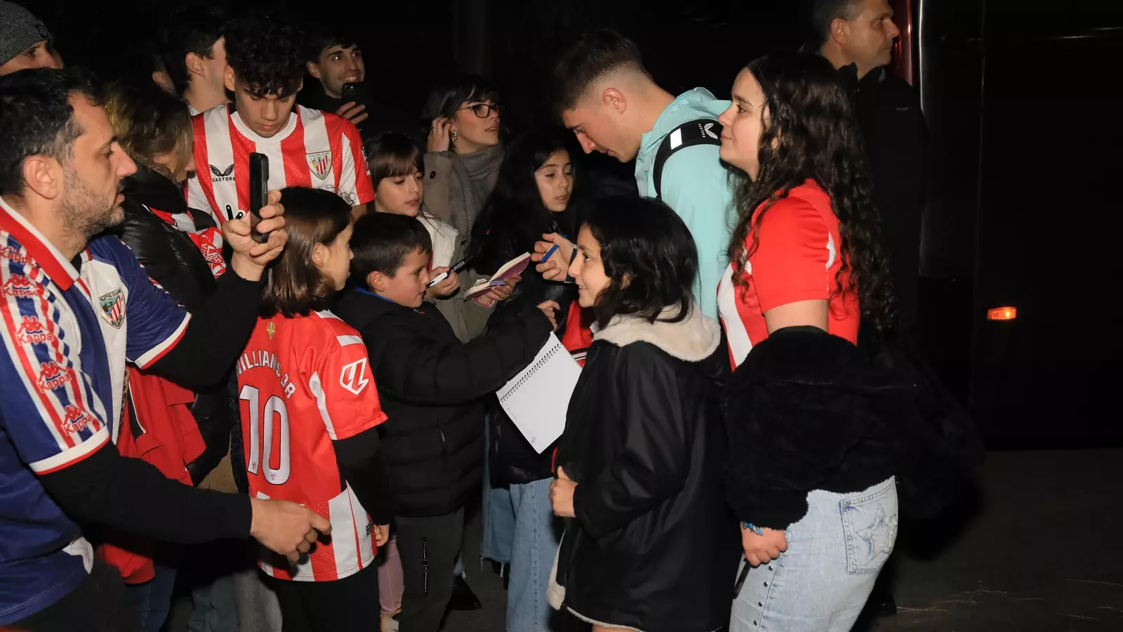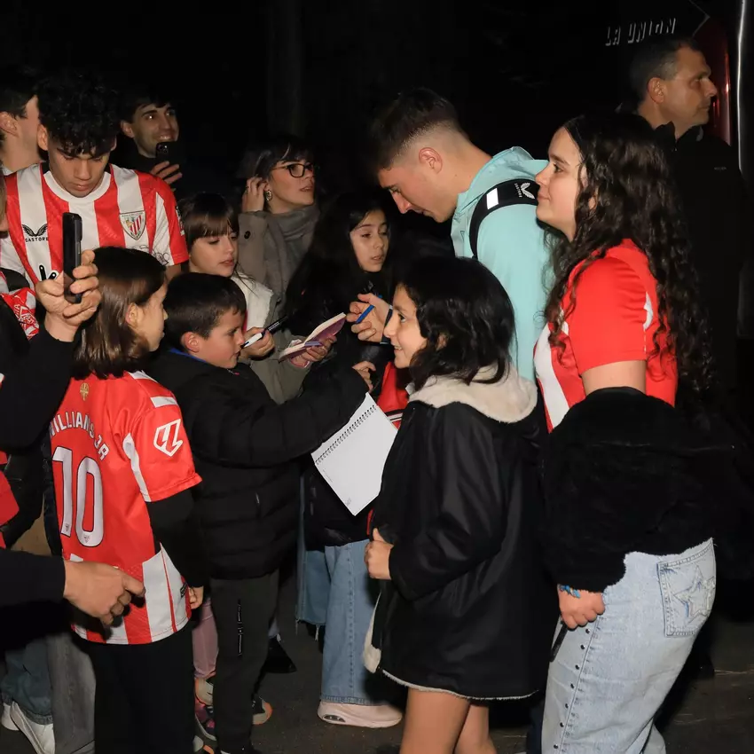 Iñaki Williams posa sonrientes con los aficionados que esperaban al equipo a su llegada a Ourense.
