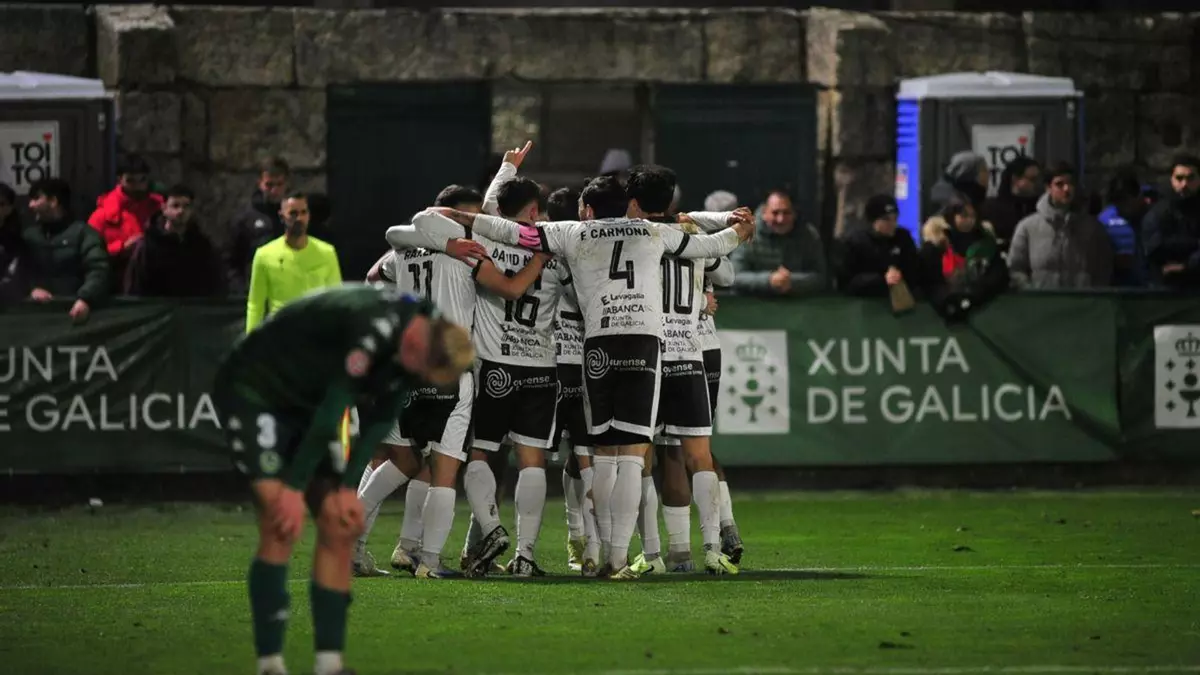 El Ourense CF sigue de dulce. Esta jornada se llevó el derbi disputado en Espiñedo ante el Arenteiro, por 0-2, una victoria justa y merecida que deja muy tocado a los verdes, si no lo estaban ya, y que permite a los chicos de Dani Llácer por primera vez salir de los puestos de descenso.
