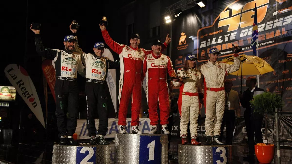 Cambió el escenario pero no la sensación del deber cumplido. El Parque de San Lázaro fue en esta ocasión el elegido para poner el broche a la 48ª edición del Rally de Ourense, sirviendo como escenario para los tradicionales posados en el podio. Sonrisas y brazos en alto para los primeros clasificados de una prueba que, a parte de la foto final de rally con los tres primeros clasificados (el tándem vencedor Ares-Bañobre, bien escoltado por los hermanos Vallejo y García-Liso), permitió también el desfile por la zona de honor del céntrico parque de la ciudad de los vencedores en todas las categorías. Una retahíla de nombres entre los que destacó el ourensano David Cortés en la Suzuki Swift, Miguel Fuster en dos ruedas motrices, Esteban Vallín en Adam R2 o José Alonso Liste en N2.