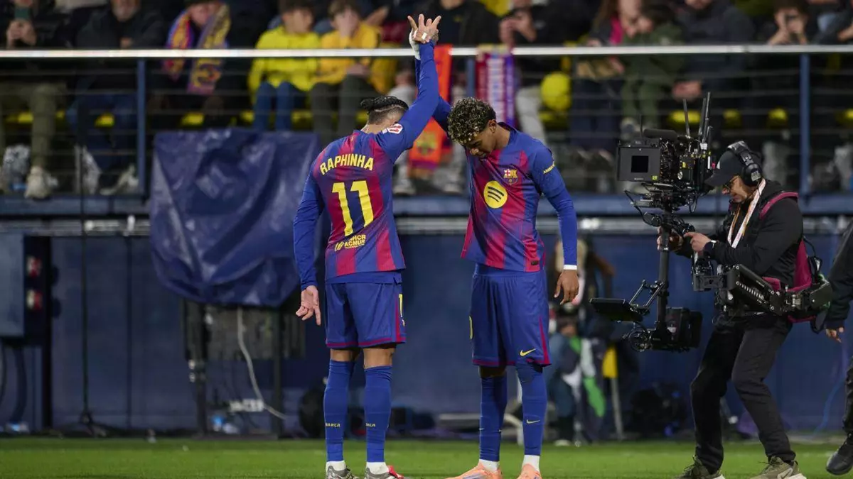El FC Barcelona venció (0-2) al Villarreal en un exigente compromiso que resolvió el líder con los goles de Raphinha y Lamine Yamal, condenado el Submarino por la falta de acierto y la expulsión de Renato Veiga en el minuto 39.