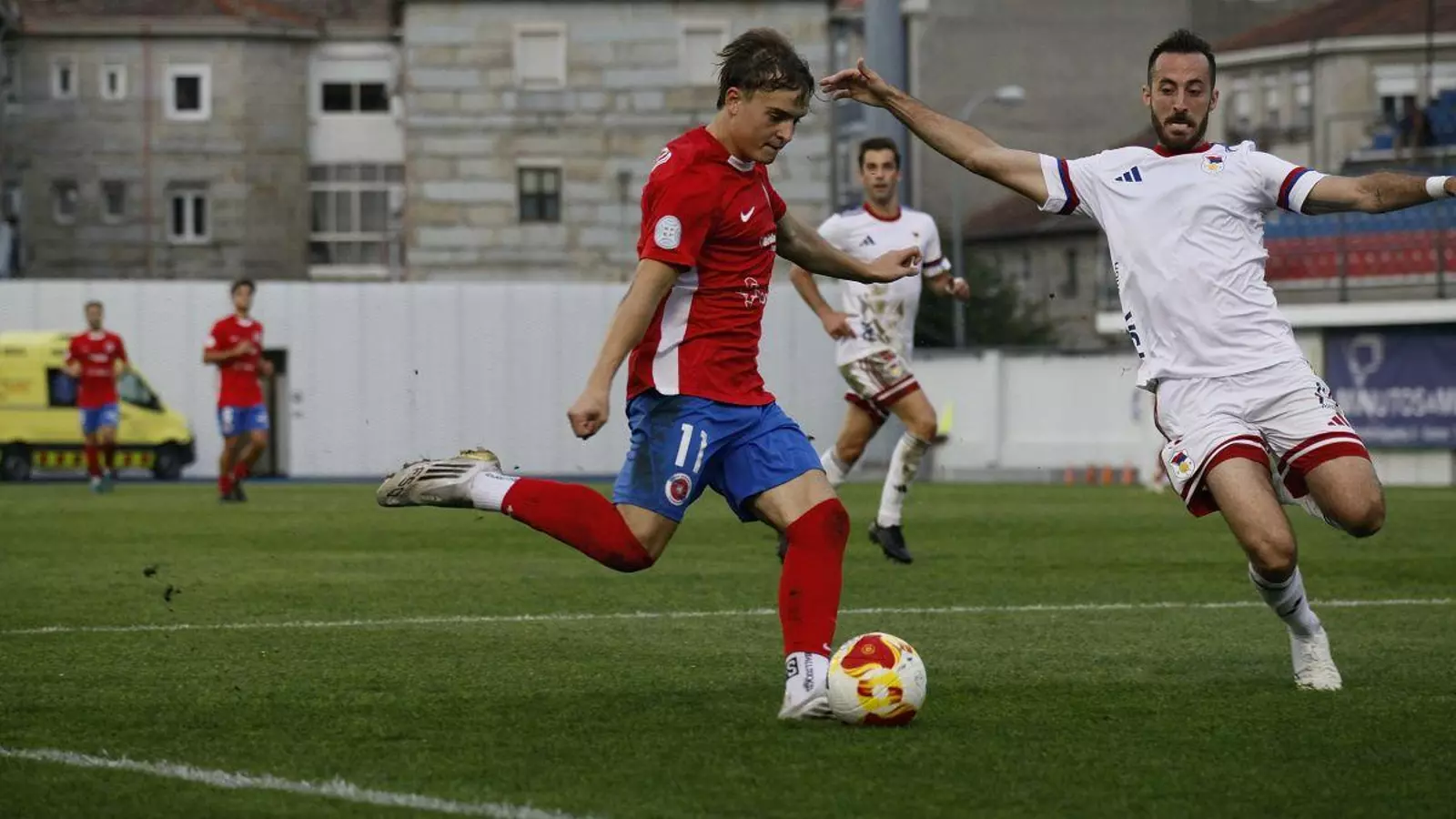 Y cuando el partido estaba controlado para llegar el descanso llegó un despiste defensivo un penalti de Noel a Samu Pérez que Manu Vizoso, que jugó por la lesión en el calentamiento de Rielo, paró para conservar la ventaja al intermedio. Primer momento malo que sumado al inicio del segundo tiempo, con el equipo un poco fuera de sito y con un remate de Pablo Pérez de cabeza al larguero, fueron la clave del triunfo final, porque desde ese momento la UD Ourense jugó de nuevo minutos de gran fútbol, presión y robo alto y con tres jugadas de mano a mano de Simón Luca, Jaicencho y Santi de Prado que el portero Nacho Torre salvo con los pies para impedir una goleada clara.