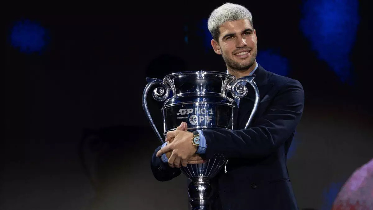 Carlos Alcaraz recibe el trofeo como número 1 del año 2025 antes de afrontar hoy las semifinales en las ATP Finals