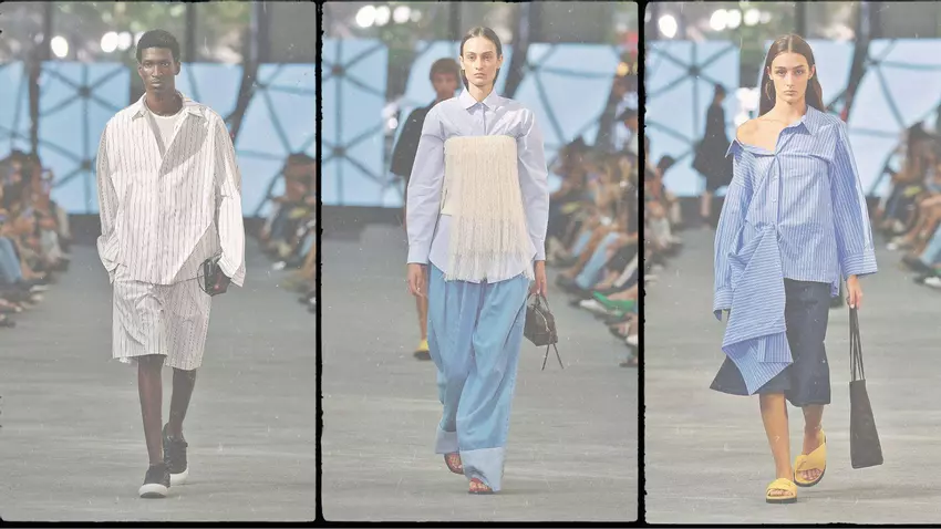 La colección destaca por sus volúmenes fluidos y un patronaje experimental que aporta movimiento sin perder estructura. Los drapeados ganan protagonismo, al igual que las texturas trabajadas con bordados y puntadas visibles, que añaden relieve y detalle a siluetas aparentemente sencillas. Vestidos y camisas que se deslizan suavemente de un hombro, faldas amplias que acompañan el paso y tejidos ligeros que reaccionan ante el movimiento.