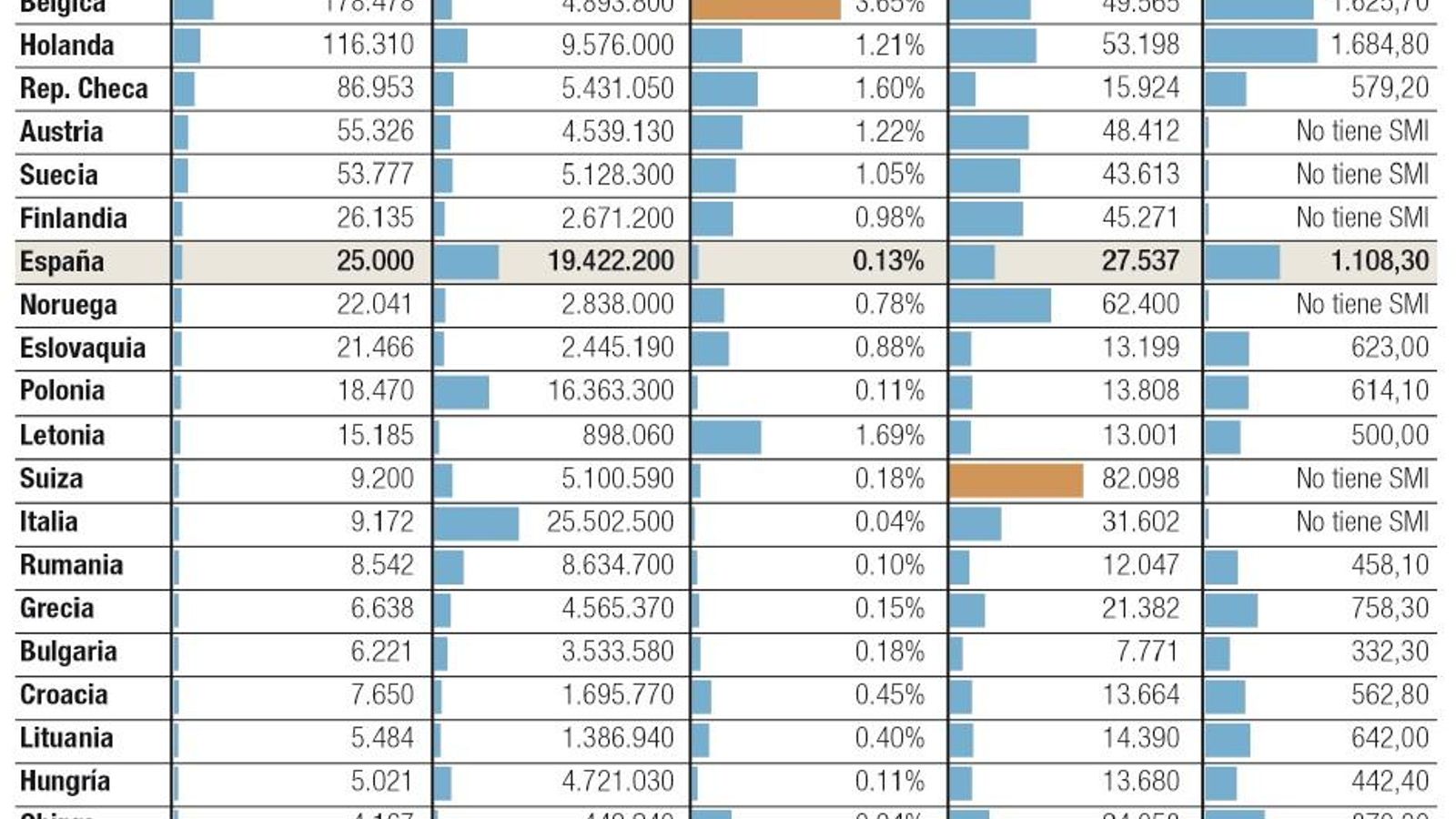Cabe matizar que los países nórdicos, Austria, Italia y Suiza no tienen regulado ni fijado el SMI. En Suiza, rige solo en tres de sus 26 cantones. El último en sumarse fue el de Ginebra, que lo instauró en noviembre, tras una de las tan recurrentes votaciones que se suceden en el país helvético. Y Ginebra lo hizo a lo grande, al establecer un salario mínimo de 3.700 euros al mes, el más alto del mundo.