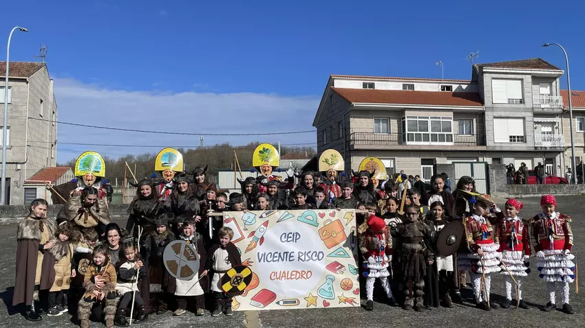 Un numeroso grupo de pequenos castrexos tomou o venres á mañá o CEIP Vicente Risco de Cualedro, protagonistas do seu desfile tradicional. Profesorado e pais e nais acompañaron aos máis cativos, nun percorrido polos viais principais do núcleo principal.