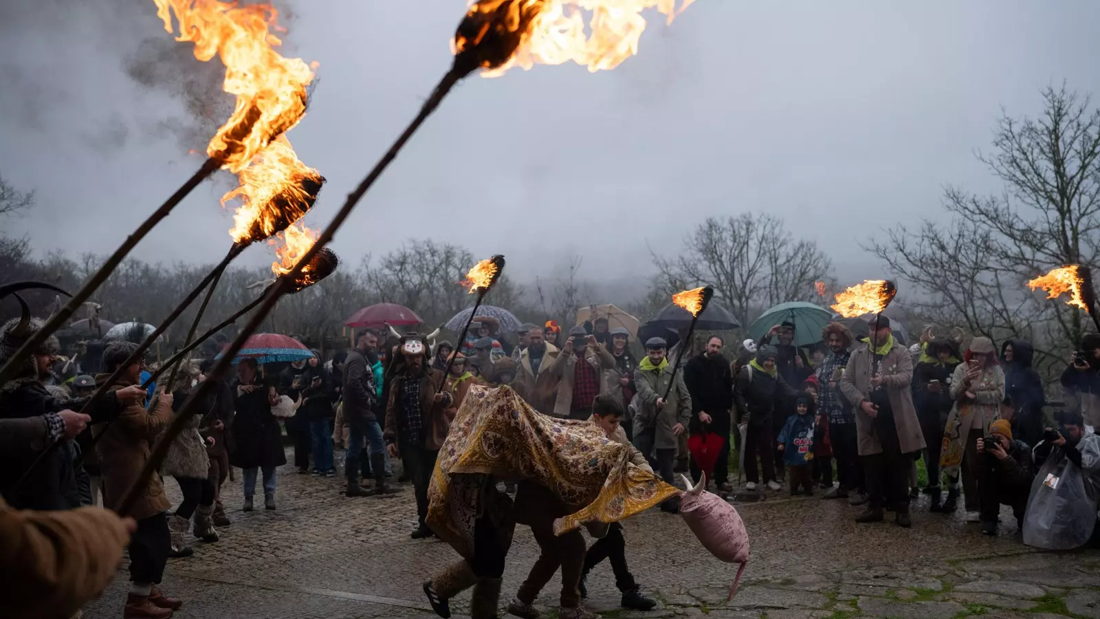 “Pero faltan os bombos”, queixouse unha cativa á súa nai: “non poden tocar porque chove”, explicoulle. Para a alegría de moitos, o Barullón de Carguizoi estaba esperando abaixo á comitiva, resgardados polas carpas.