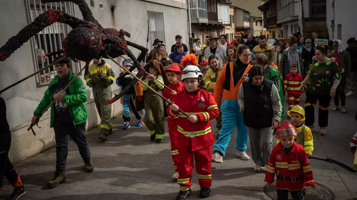 A gran formiga infantil chegou xusto a tempo ao desfile do colexio O Castiñeiro tras uns arranxos de última hora. Tampouco faltaron o burro de madeira nin a Morena dos cativos, nun roteiro que sintetizou os rituais do ciclo entroideiro lazao e rendeu tributo a tódalas persoas que loitaron contra os lumes.