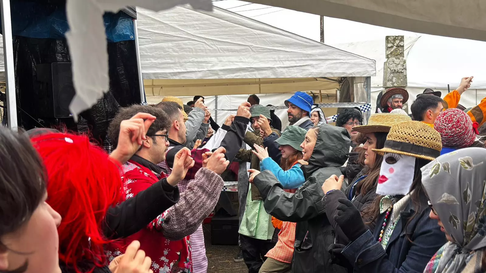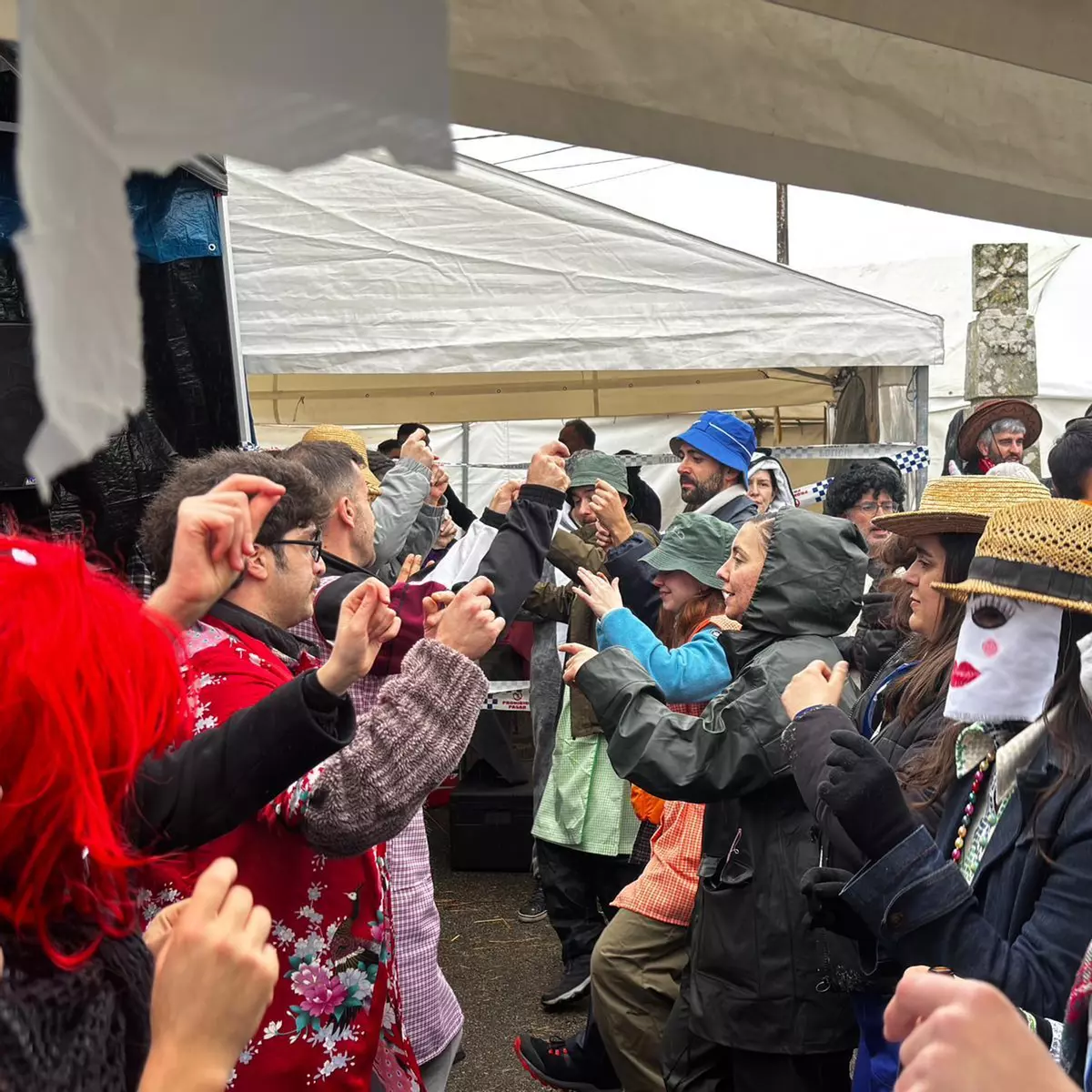 "Que vimos, a lucir o traxe ou a bailar?", le preguntó con sorna una amiga a otra, vestidas con atuendos inspirados en la Galicia rural. Los Pandereteiros de Traspés pusieron la banda sonora a una mañana de bailes bajo la lluvia, canciones y muchas risas. Los vecinos también ofrecieron comida a los asistentes, que entre trago y trago fueron dando buena cuenta de ella.