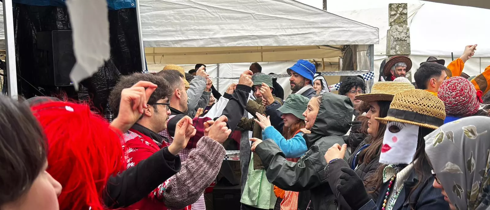 Los felos hicieron acto de presencia a media mañana, acompañados de la lluvia y cientos de personas que buscaban refugio bajo las carpas instaladas por la organización, formada por los vecinos de la localidad. Después de hacer sus trastadas habituales, los protagonistas se fueron retirando para dar paso a otro de los atractivos de esta celebración: El canto y el baile.
