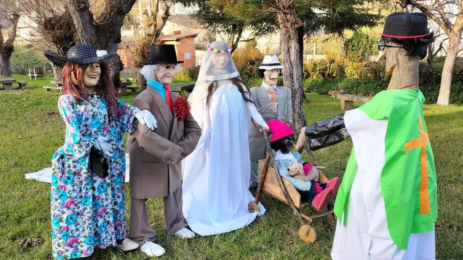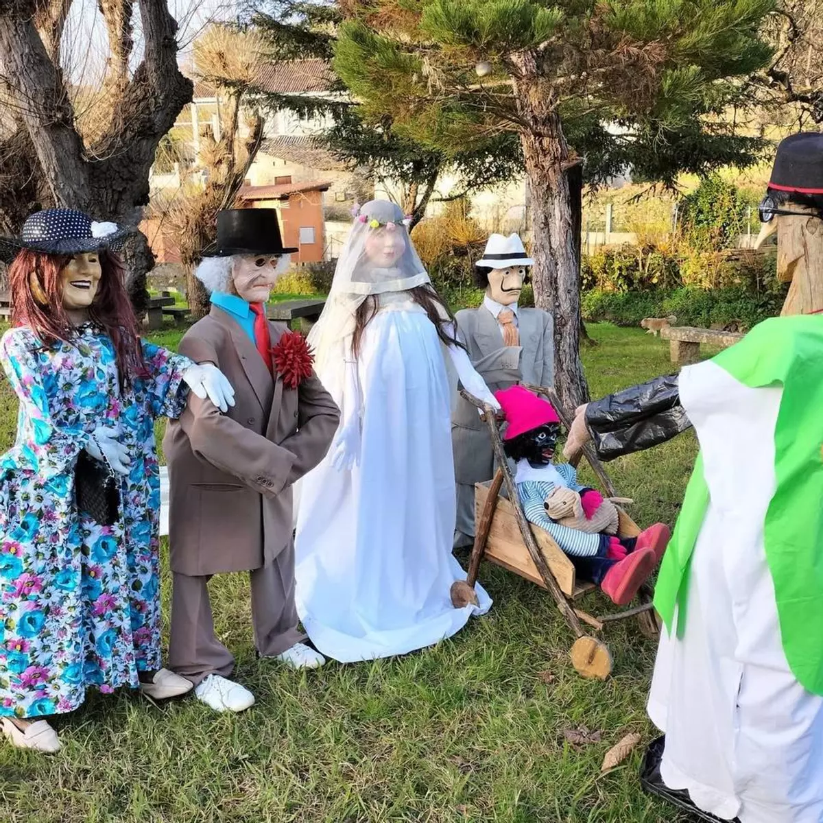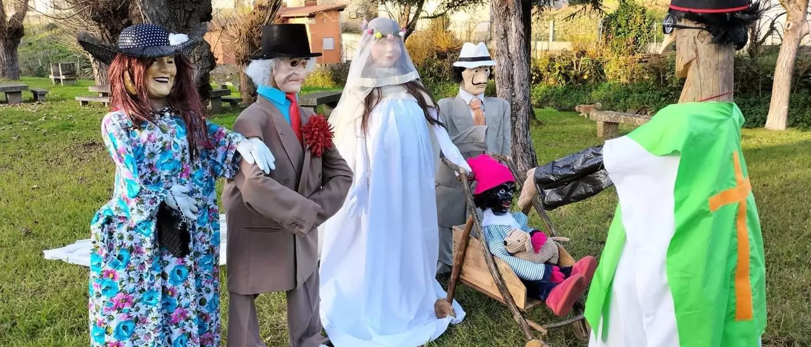 En esta aldea de un centenar de habitantes, Mecos y vecinos convivirán durante el Entroido. Toda la puesta en escena es gracias a la labor de María González, Luisa Rodríguez, Benito Trigos, Aurora Calviño, Julia Vispo, Julio Fernánez y Benigno Ferreiro, que es el creador de estas figuras de madera, a las que después visten con determinados atuendos en función de la escena que decidan recrear.