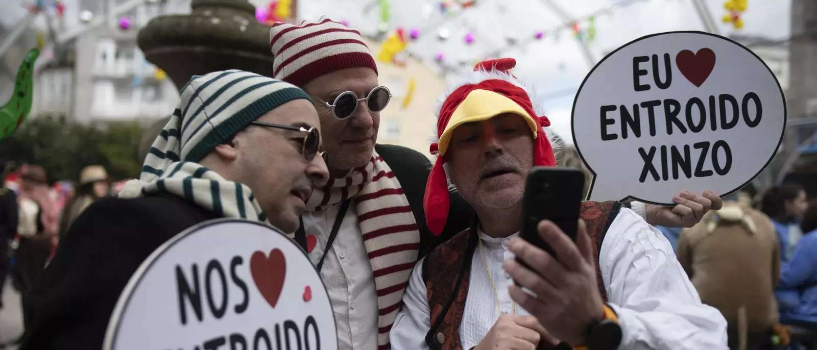 Esta primera fecha de la semana grande de Entroido luce su declaración de Interés Turístico Internacional, atrayendo a muchos visitantes que se hacen notar por sus acentos. No solo de fuera de Galicia y el resto de España, si no también de ciudades cercanas como Vigo, de donde llegaron Victoria y Constanza, que también disfrutaron en compañía de sus padres el primer día de Entroido de sus cortas vidas.