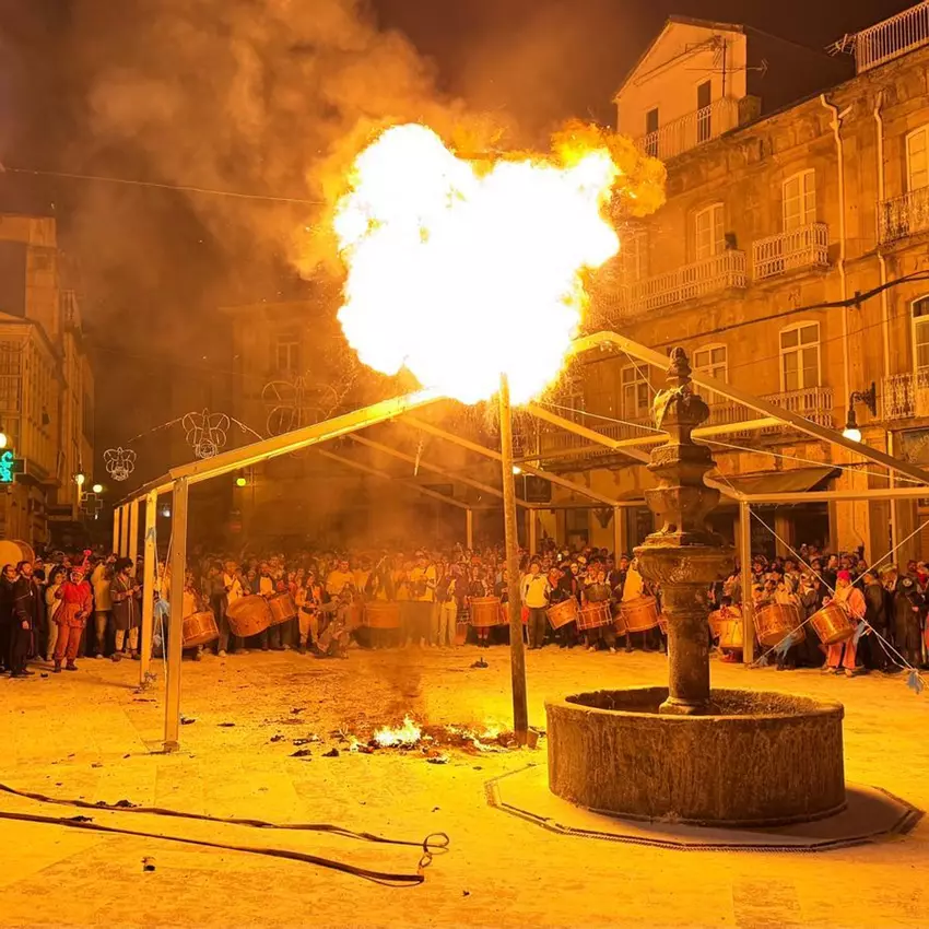 El fuego se convierte en protagonista, iluminando la escena y mezclándose con el vibrante sonido del fulión, cerrando así un ciclo hasta la próxima anualidad y dejando en el aire la emoción y la tradición que hacen único al Entroido de Viana do Bolo.