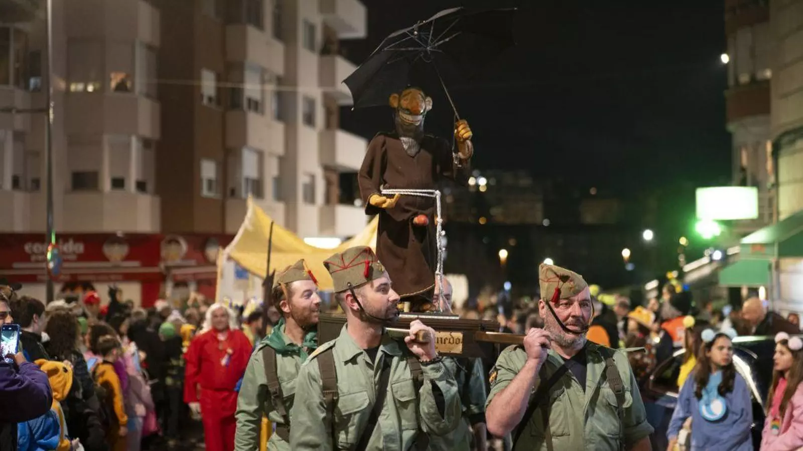 La procesión tomó la avenida de As Caldas pasadas las ocho de la tarde, que pese a la lluvia estaba abarrotada. Encabezando este peculiar desfile, “legionarios” llevaron a hombros a Frei Canedo rodeados de una multitud que esperaba con ganas este momento. El resto de cofrades acompañaban detrás a su santo, junto a las distintas comparsas que se encargaron de poner color a este ritual con disfraces de globos aeroestáticos, carretes de hilo o caramelos.