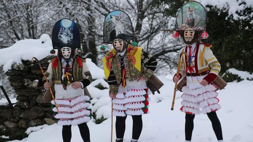A primera hora de la mañana, varios grupos de felos se dieron cita en Maceda para salir a recorrer las aldeas de la sierra en su tradicional ruta, que en esta ocasión lucía una estampa atípica. Os Felos da Corga da Serra -en las imágenes-, salieron desde el Bar Cortés pasadas las 10,00 horas, haciendo frente al frío y la nieve.