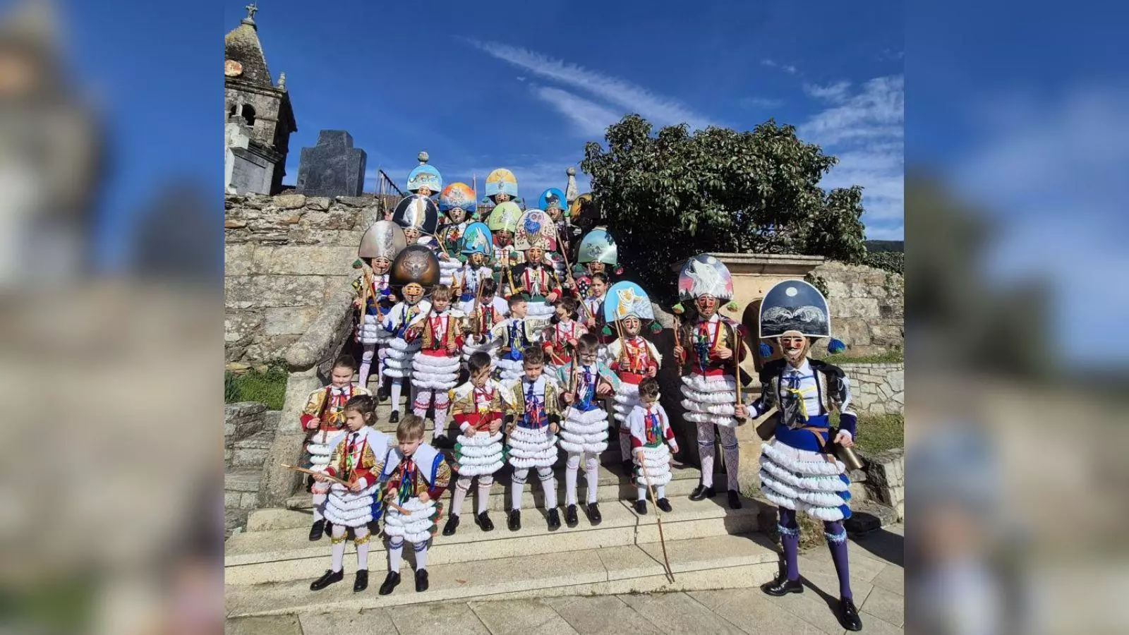Os peliqueiros fixeron de novo pasillo aos veciños á saída da misa. Entre carreiras e saúdos da veciñanza aos seus peliqueiros, tamén houbo tempo para que estes sacaran unha foto de familia nas escaleiras de acceso á igrexa parroquial.
